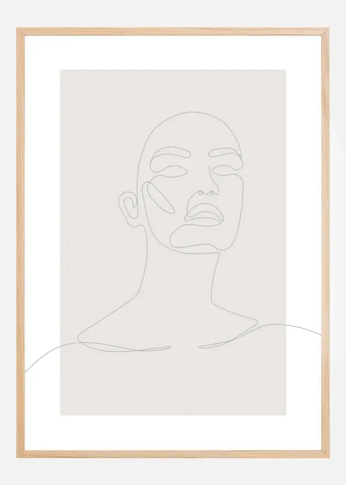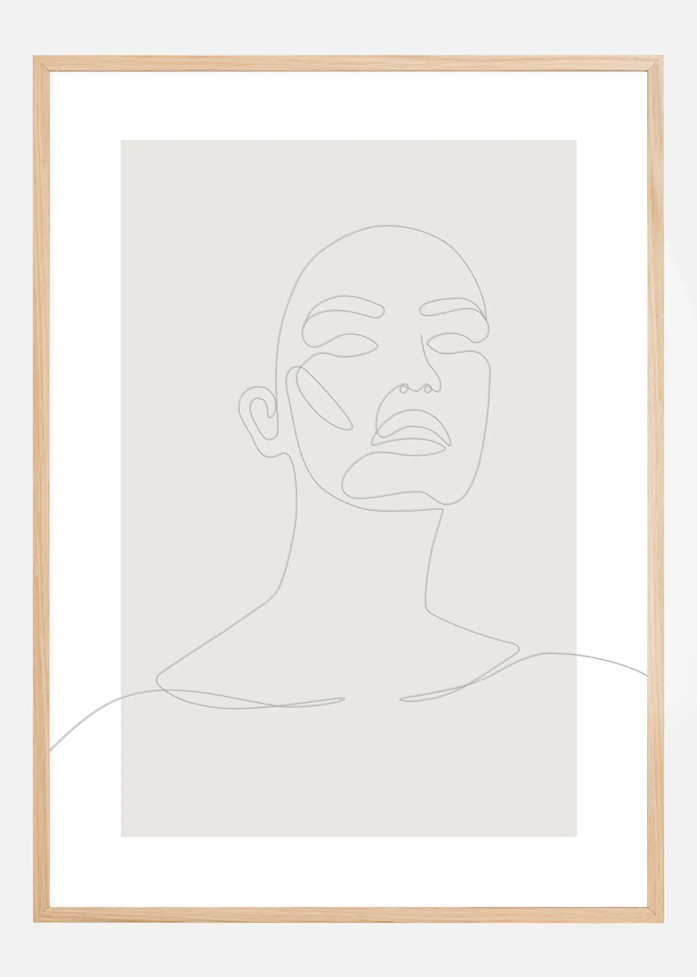 Een unieke abstracte portret poster van een gezicht dat uit één enkele lijn bestaat. De dunne zwarte lijn beweegt moeiteloos over de pagina en creëert in één keer een heel gezicht. De zachtgrijze achtergrond zorgt ervoor dat je goed naar deze poster kijkt om alle details te kunnen waarderen.