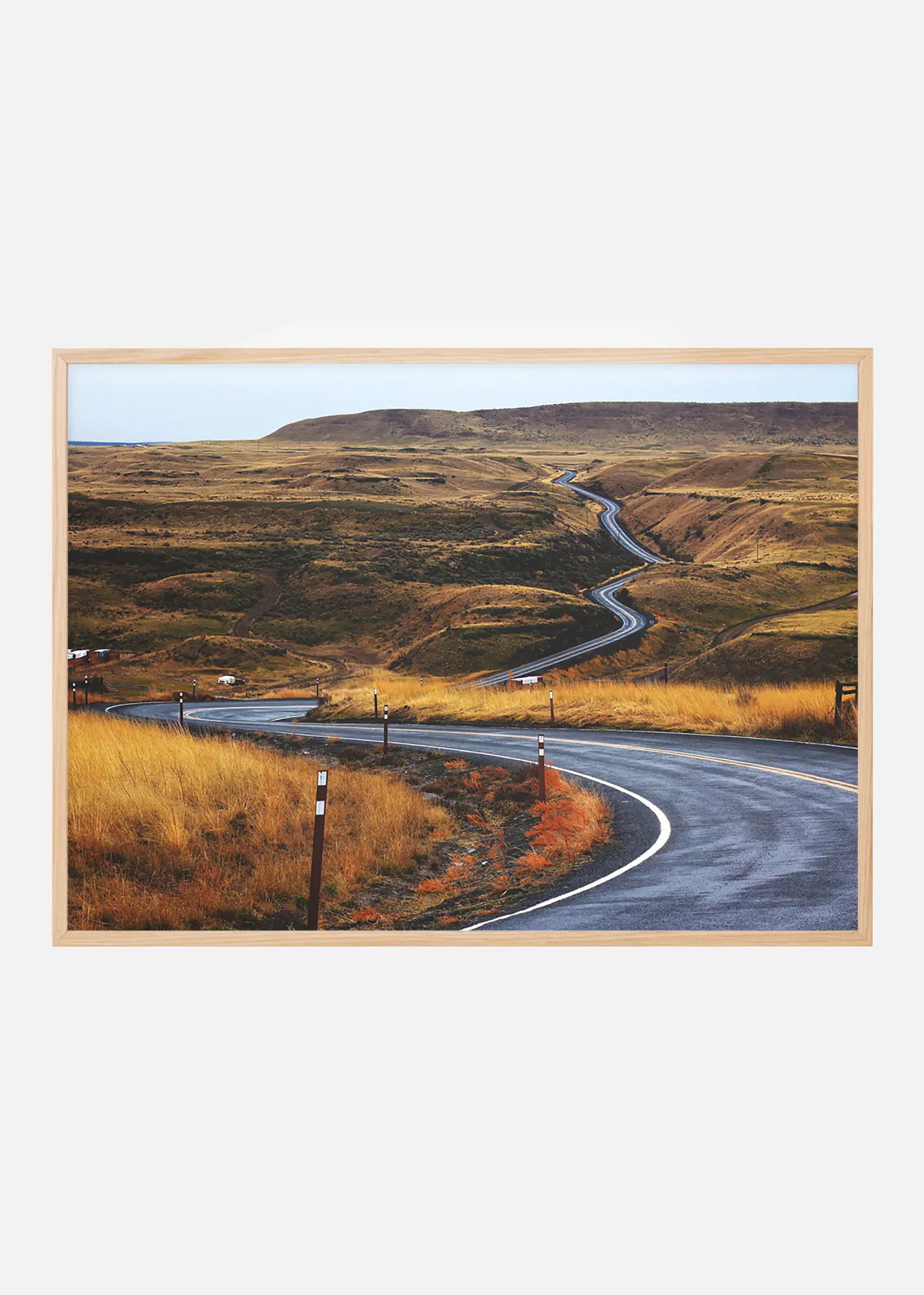 Poster met een asfaltweg die zich een weg baant door een door de zon geblakerd steppe landschap. De geelbruine tinten van het gras tegen het koude oppervlak van het asfalt, dat zich een weg door het open landschap breekt, zorgen ervoor dat de blik in het beeld wordt getrokken en de weg volgt. De affiche past goed in een minimalistische lijst waar het motief tot zijn recht komt en kan goed gecombineerd worden met andere posters voor een thema.