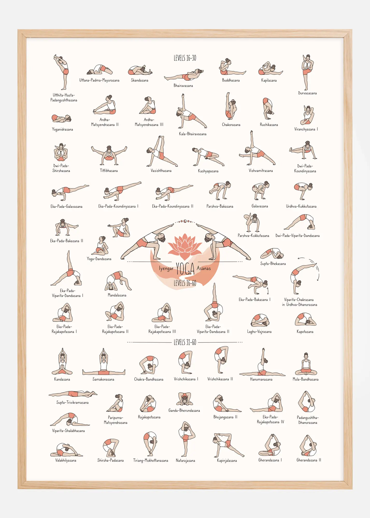 In het centrum van de poster staat de titel 'Iyengar YOGA Asanas' omgeven door een lotusbloem, die diepgeworteld is in de symboliek van yoga. Het ontwerp van de poster is niet alleen visueel aantrekkelijk, maar ook praktisch en kan worden gebruikt als referentie tijdens yogabeoefening of als een decoratieve inspiratiebron in yogastudio's en huizen. Bovendien kan het warme en uitnodigende kleurenschema gemakkelijk worden afgestemd op verschillende interieurstijlen en een rustige en gastvrije sfeer creëren waar het wordt geplaatst.