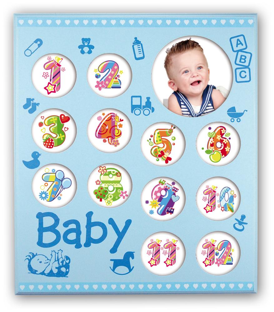 Schattige blauwe collagekader van hout met schattige babysymbolen en plek voor 12 kleine foto's van 7x7 cm en een grotere foto van 13x13 cm. De perfecte collagelijst voor het inlijsten en herinneren van de eerste tijd van je baby. Verzamel je favoriete foto's van de babytijd en maak je eigen persoonlijke fotocollage!