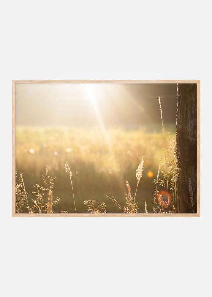 Poster met een sepia-gekleurde tegenlichtfoto van een nazomerweide met zaaiende grassprieten op de voorgrond. Het motief is rustig en je kunt bijna het geluid van de sprinkhanen horen in de milde zomeravond. De poster past goed in alle soorten interieurstijlen met zijn gedempte kleurenschema en is mooi om op te hangen samen met andere natuurmotieven.
