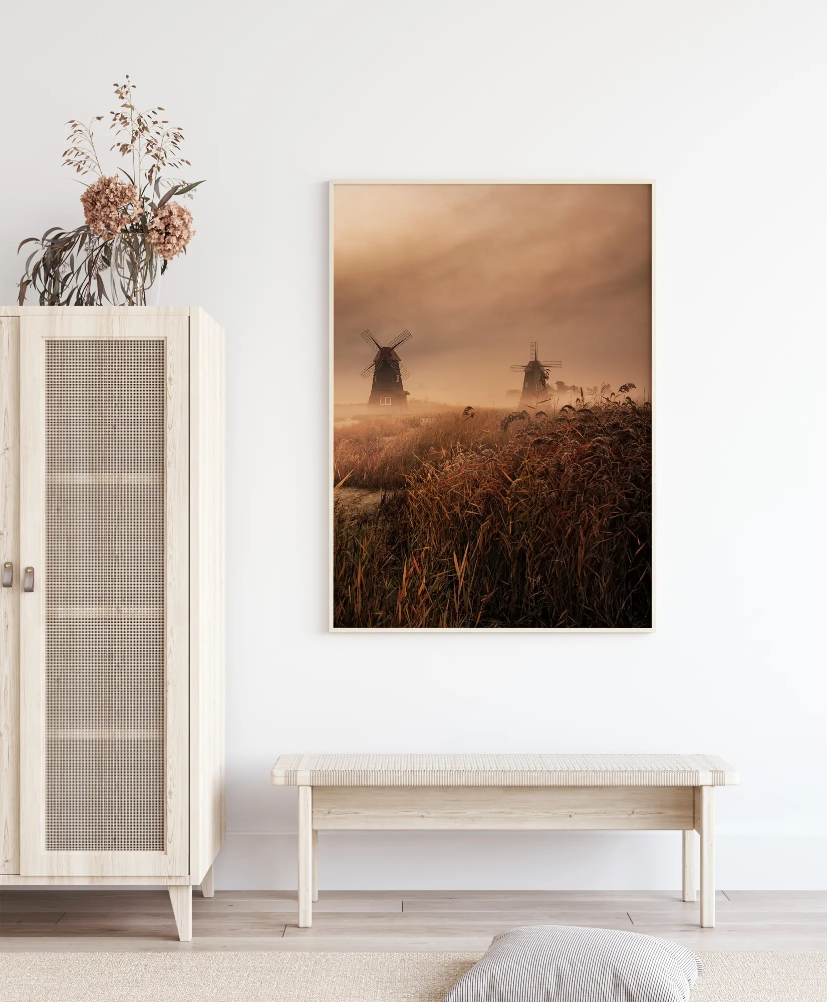 Een surrealistische poster van een tarweveld in close-up met twee in mist gehulde windmolens op de achtergrond. De vroege ochtendschemering is een prachtig sepia met mist en wolken die een mystieke sfeer creëren. Combineer de zachte roze en oranje pasteltinten van deze poster met koelere blauwtinten voor een magische uitstraling.