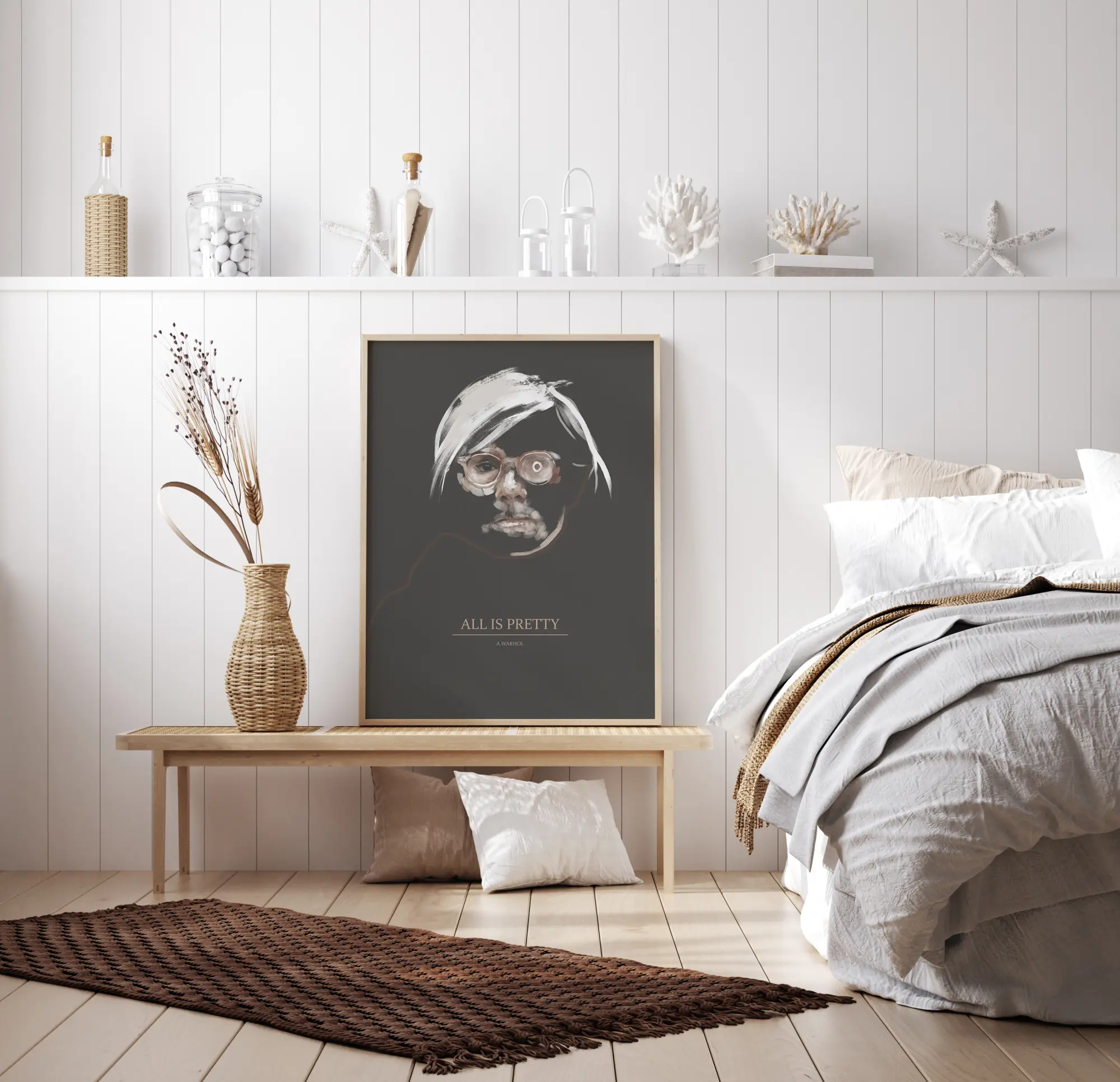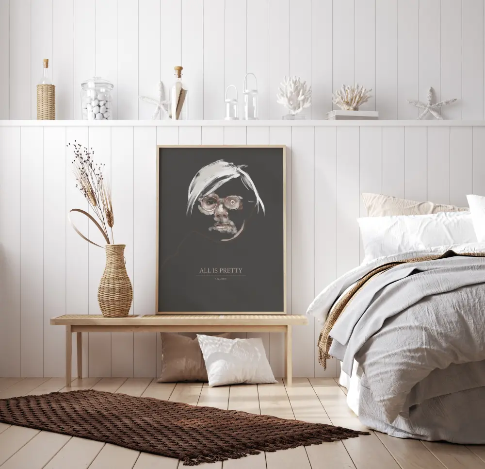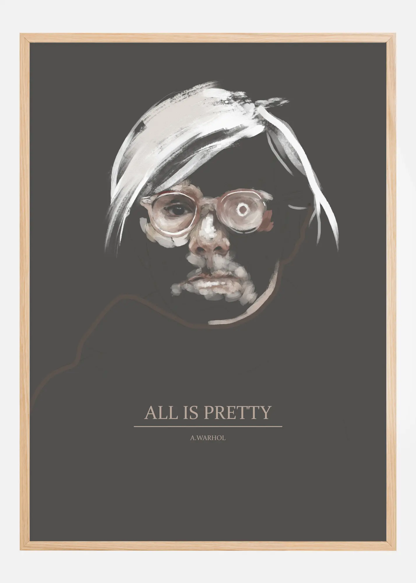 Een kunstenaarsposter van Andy Warhol. Dit portret van de kunstenaar toont zijn witte haar en concentreert zich op zijn ogen. Het ene oog kalm, het andere wild. De slogan "All is Pretty" zit aan de onderkant om je een inspirerend citaat en boodschap te geven wanneer je er in jouw huis langsloopt.