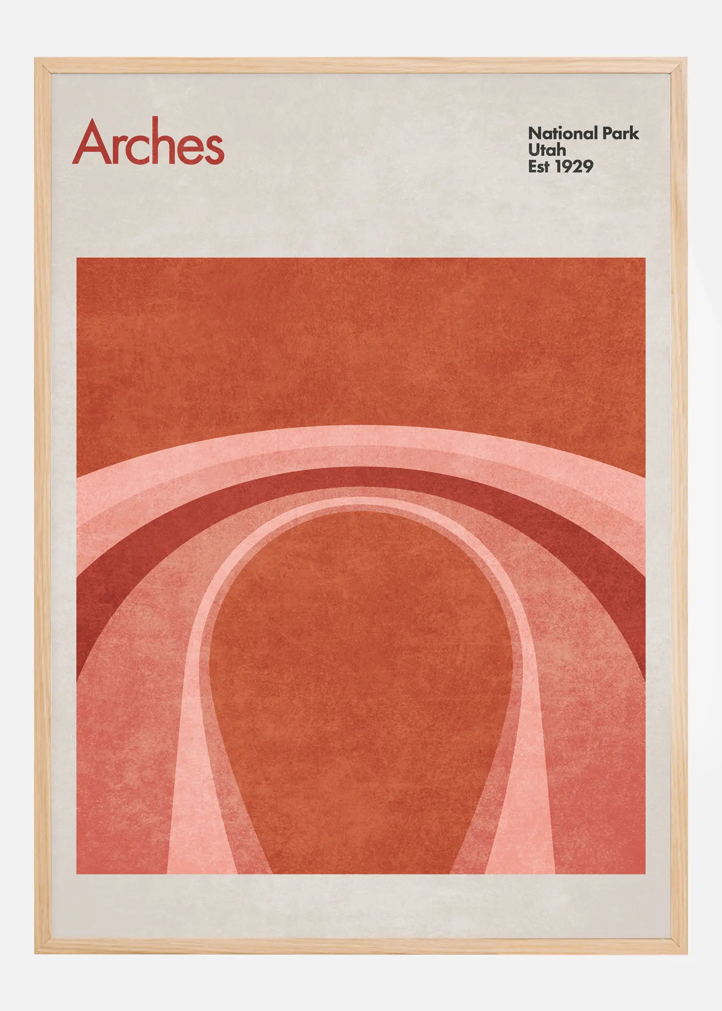 Deze minimalistische en eigentijdse poster eert Arches National Park in Utah met zijn gestileerde weergave van de beroemde geologische formaties van het park. De concentrische boogvorm die in het midden van het ontwerp staat, is een abstractie van de natuurlijke bogen die het unieke landschap van het park vormen, hier vastgelegd op een pure en visueel aantrekkelijke manier.