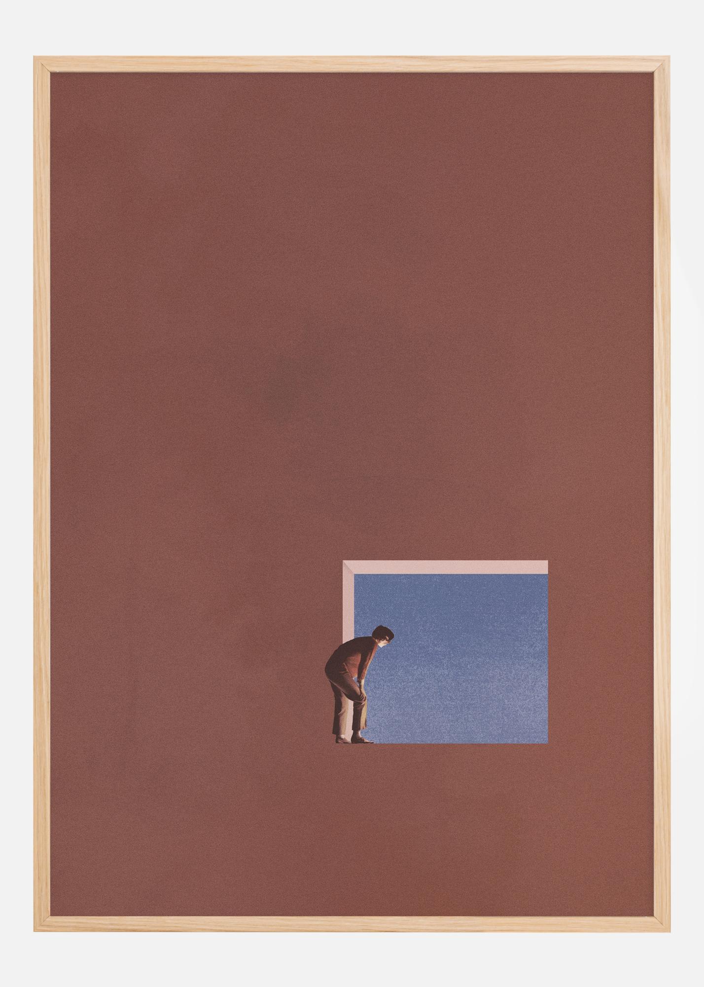 Deze suggestieve en conceptuele poster vangt een individu dat voorover buigt, kijkend door een vierkante opening in een blauwe ruimte die het omringende bruine oppervlak doorbreekt. Dit eenvoudige maar krachtige beeld kan worden gezien als een representatie van nieuwsgierigheid en het menselijke verlangen om te verkennen en het onbekende te ontdekken. Het kan ook een metafoor zijn voor het raam van mogelijkheden en het belang van het grijpen van de kans wanneer deze zich voordoet.