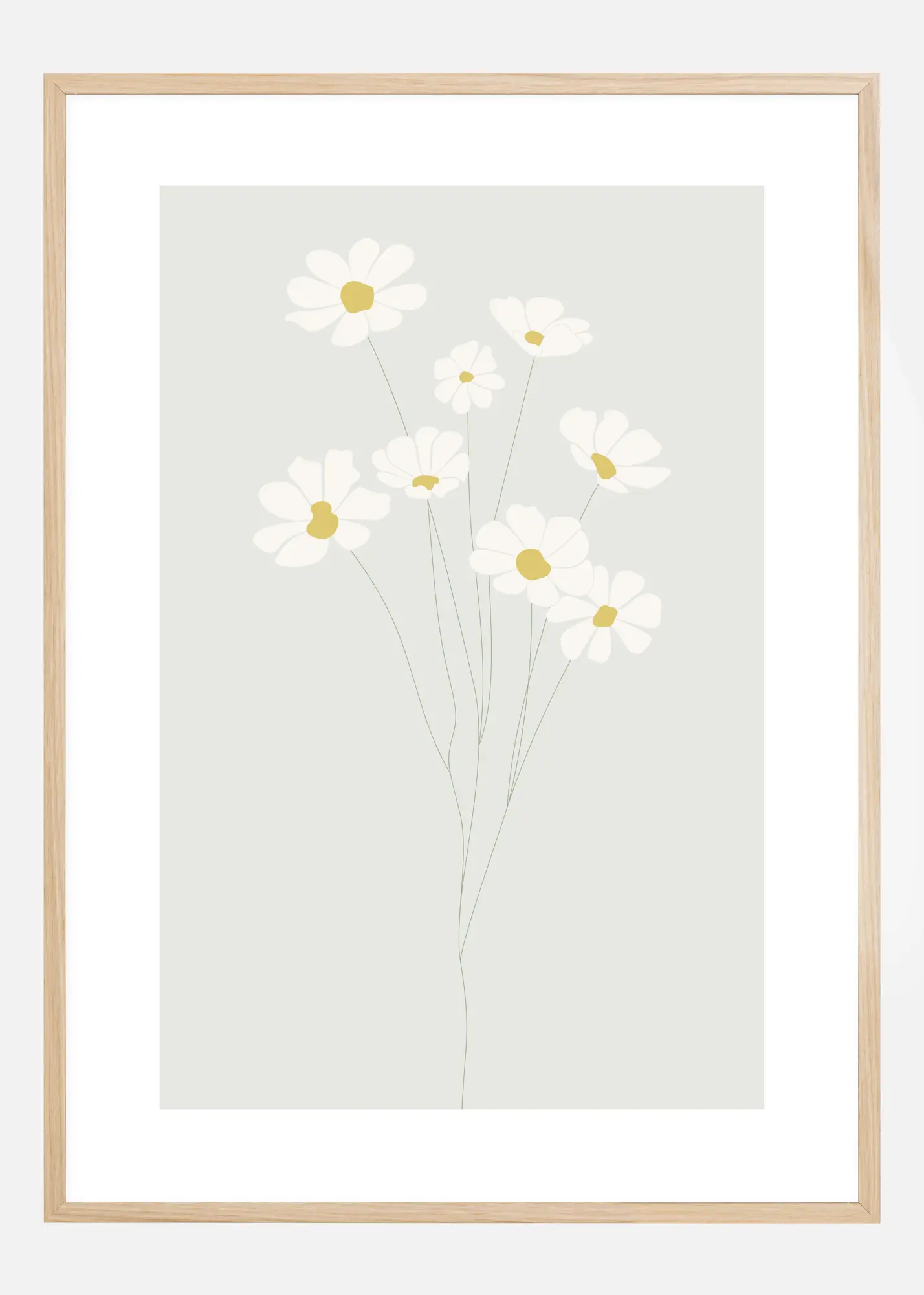 Een subtiele poster van een madeliefjesprint met een delicate uitstraling. De eenvoudige witte en gele bloemen reiken omhoog op ranke stengels en zijn geplaatst op een zachte lichtblauwe achtergrond. Voeg deze poster toe aan de slaapkamer van je kinderen voor een zachte, maar schattige vibe.