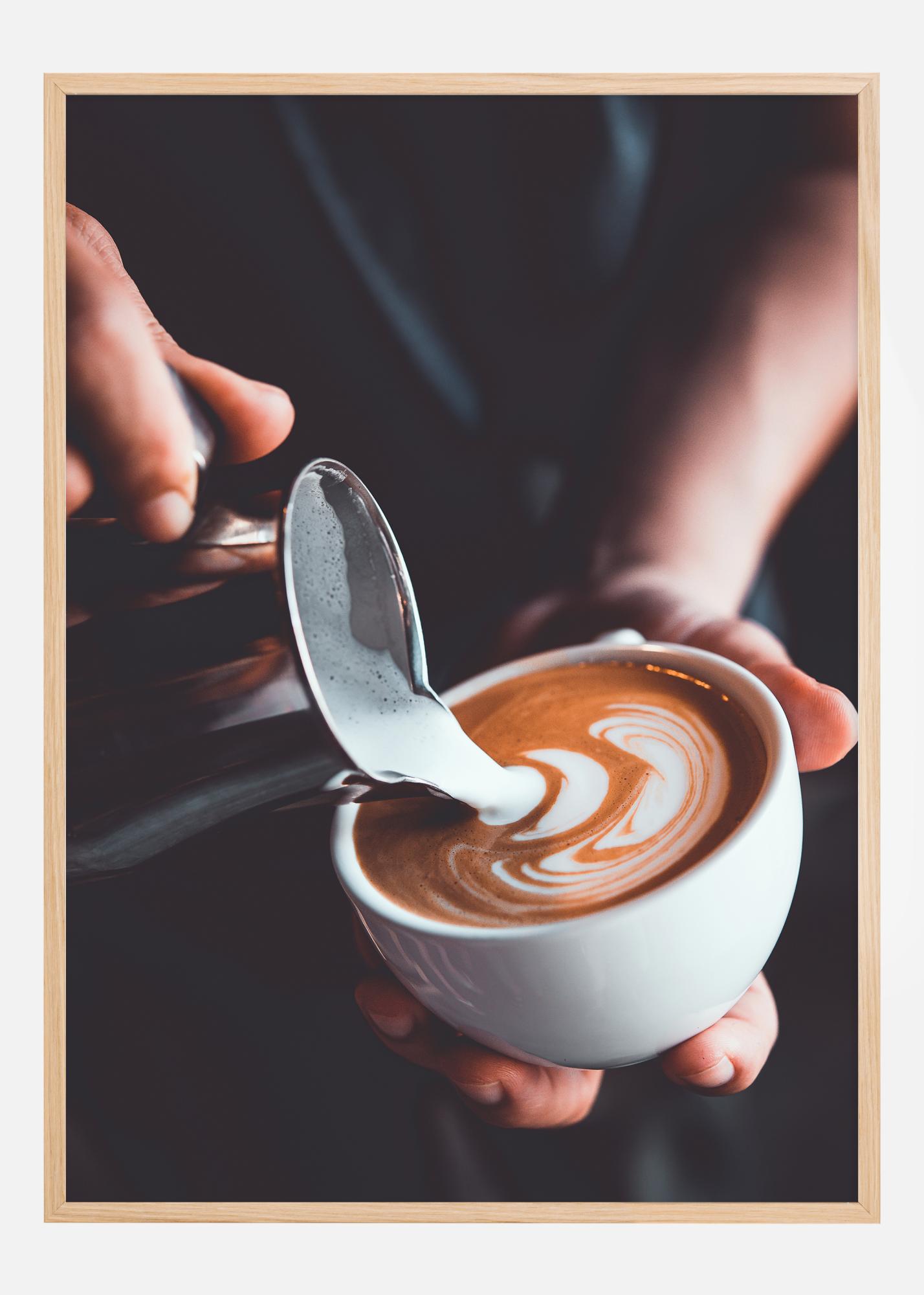 Deze affiche vangt de essentie van het paradijs voor koffieliefhebbers met een close-up afbeelding van handen die de perfecte cappuccino creëren. Het motief toont de kunstenaar achter de koffiebar in een bijna dansachtige ritme wanneer de melk voorzichtig wordt geschonken om een prachtig hartpatroon in het schuim te vormen. De donkere achtergrond van de poster benadrukt de warme tinten van de koffie en het glinsterende oppervlak van de weelderige melk, wat uitnodigt tot een gevoel van comfort en genot.