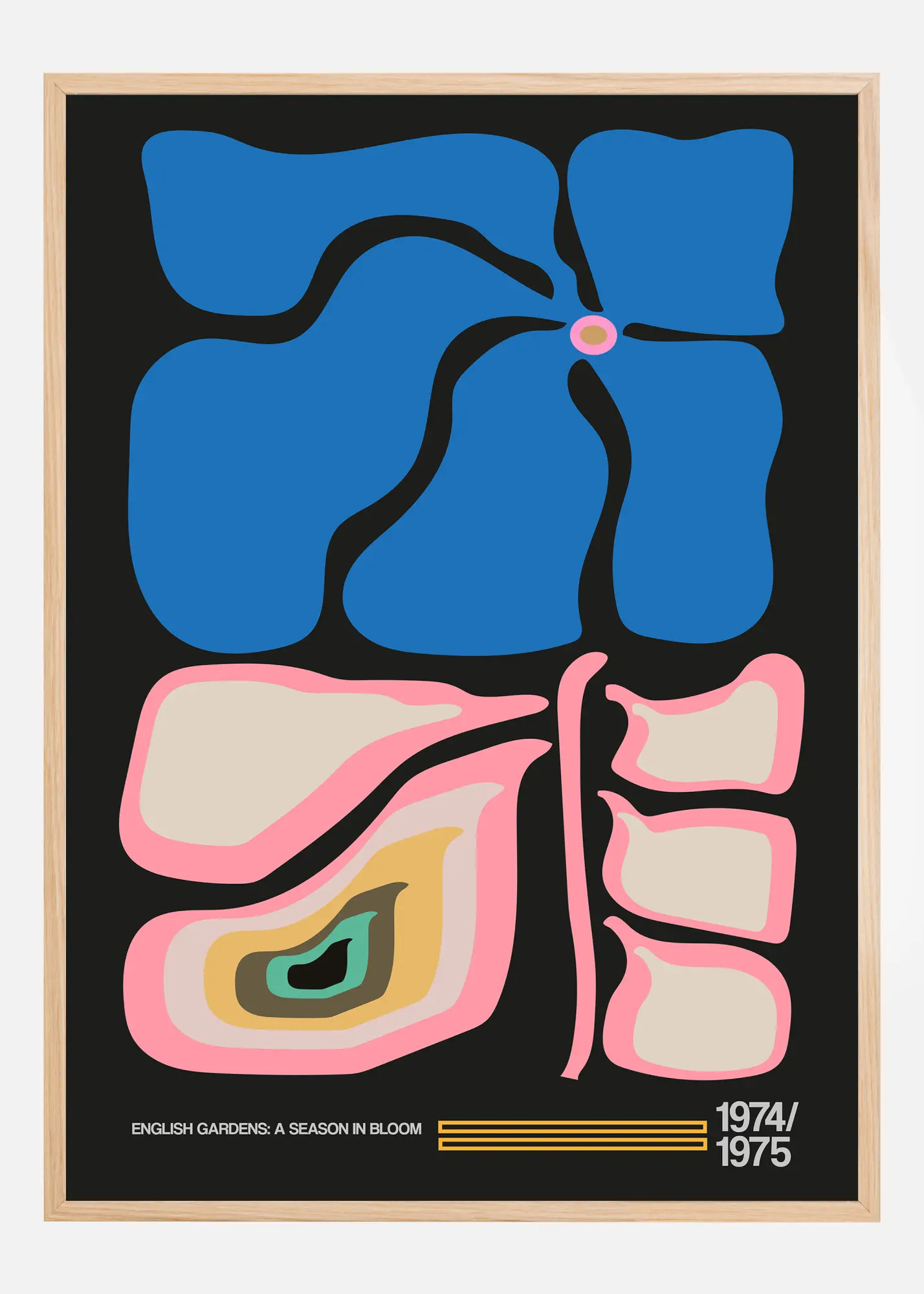 Deze creatieve en kleurrijke 'English Gardens: A Season in Bloom' poster is een esthetische hulde aan de diversiteit en pracht van bloementuinen. De poster trekt de aandacht met zijn sterke blauwe bloem die contrasteert tegen een zwarte achtergrond, aangevuld met accentkleuren in roze, beige, en een vleugje groen. Deze speciale combinatie van kleuren biedt een gedurfde en hedendaagse interpretatie van een klassieke Engelse tuin in volle bloei. Het jaartal '1974/1975' voegt een historische dimensie toe die misschien op een belangrijke periode voor tuinen of kunst wijst.
