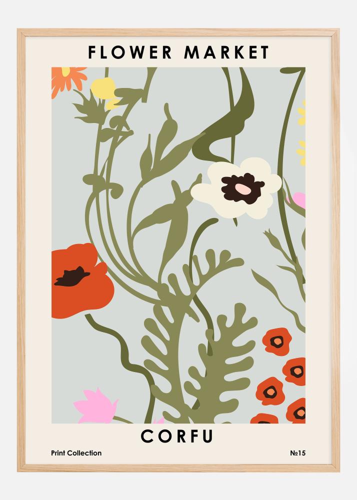 "CORFU" staat elegant gedrukt onderaan, boven "Print Collection ?15", wat het gevoel van plaats en verbondenheid versterkt. Deze print zou elke ruimte opfleuren en een vleugje van de charme van de Middellandse Zee in je huis brengen. Het kleurenschema is geïnspireerd op Corfu's rijke flora, wat een kleuraccent en visuele interesse geeft in welke omgeving het ook wordt geplaatst. Het is een perfecte affiche voor iedereen die zich wil omringen met de herinnering aan Corfu's zonnige stranden en levendige bloemenmarkten.
