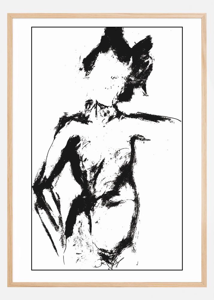 Een zwart-wit poster van een model in levenstekening. De dikke, krachtige zwarte penseelstreken hebben deze vrouw in een bijna clair-obscur stijl getekend. Staar er een tijdje naar en je zit te wachten tot ze beweegt.