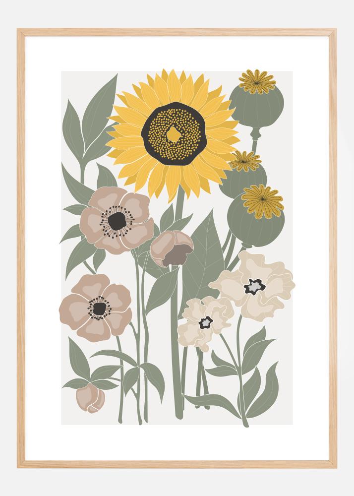 Een poster met zachte print van verschillende bloemen. Een heldere zonnebloem domineert het midden van deze tuinposter, met nog andere bloemen waaronder klaprozen. De eenvoudige afdrukstijl maakt het gemakkelijk om de details te zien en te genieten van deze zonnige poster.