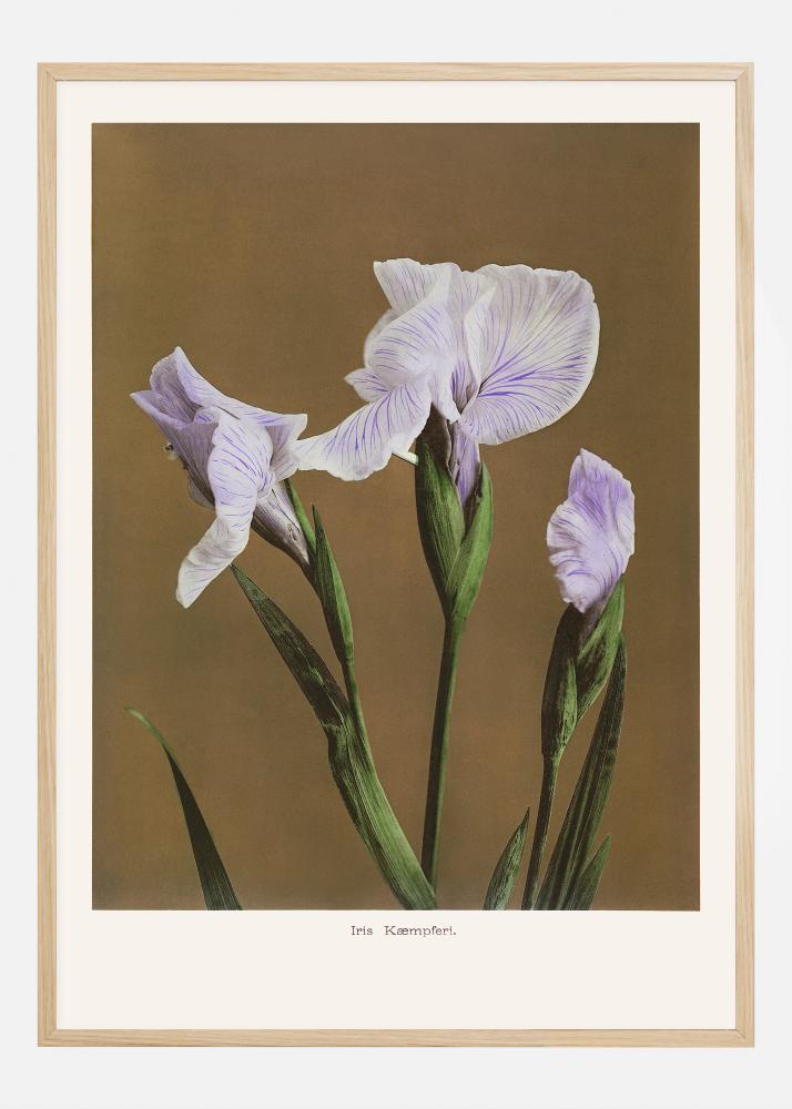 Deze voortreffelijke poster beeldt de majestueuze Iris Kaempferi af, vaak bekend als Japanse iris, die trots haar kenmerkende paarse en witte bloemblaadjes toont. De delicate bloemen in verschillende paarstinten, van pastel tot diepere streken van violet, worden aangevuld met dunne lijnen en patronen die een gevoel van finesse en detailrijkdom geven. Tegen de uniforme koffiekleurige achtergrond valt de sierlijke vorm van de plant op, waardoor deze print een opvallende toevoeging is in elk interieurontwerp.