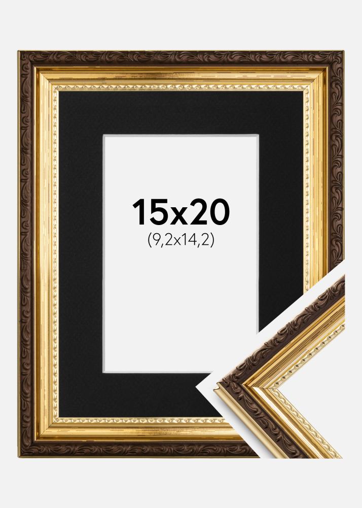 Pakket met een kader en bijpassend zwart passe-partout. In de productafbeelding staan de maten van het kader (vetgedrukt) en de binnenmaten van het passe-partout (aangegeven tussen haakjes). Let op; de binnenmaat van het passe-partout dient altijd 1 cm kleiner te zijn dan de afmetingen van de gewenste afbeelding.