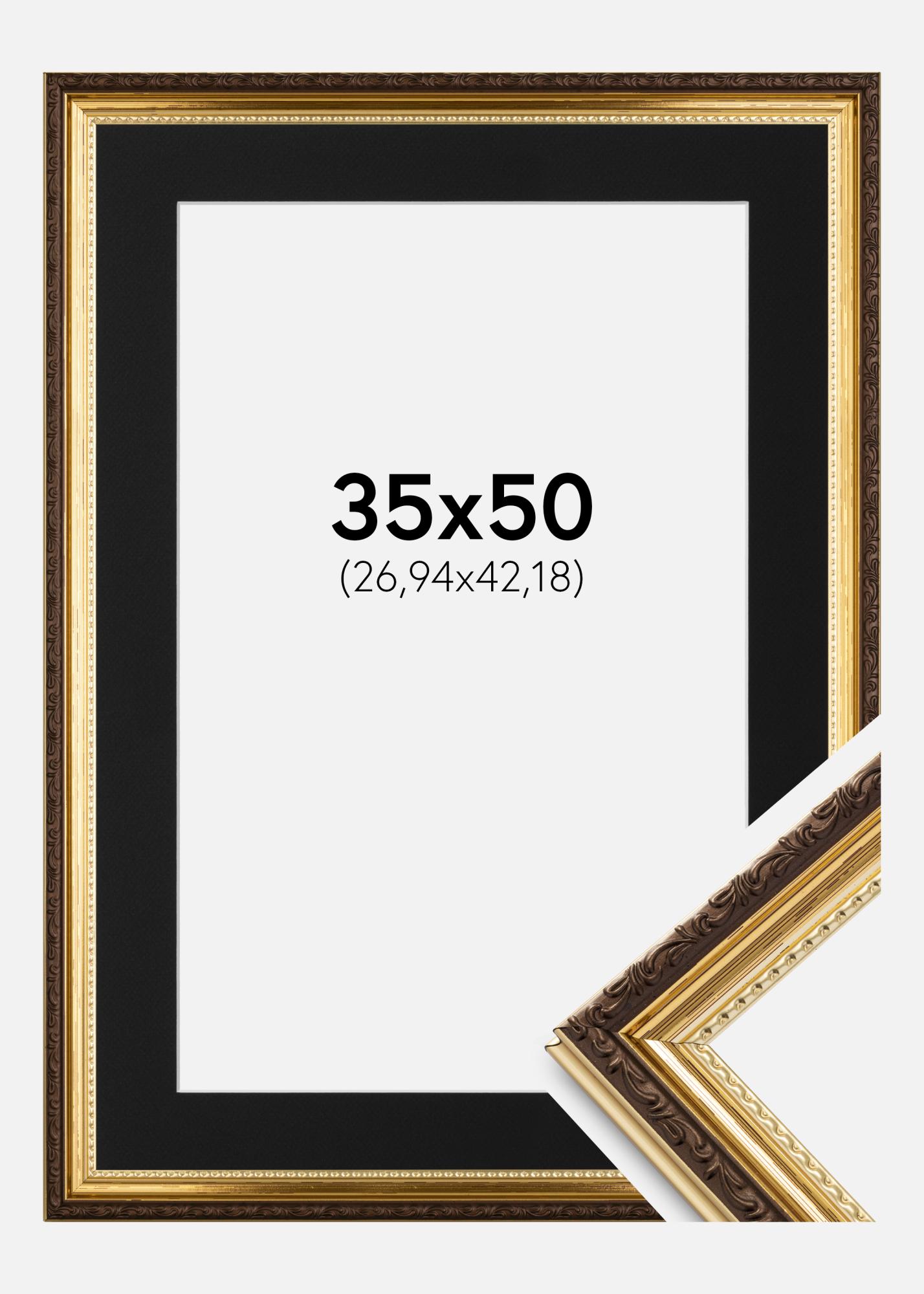 Pakket met een kader en bijpassend zwart passe-partout. In de productafbeelding staan de maten van het kader (vetgedrukt) en de binnenmaten van het passe-partout (aangegeven tussen haakjes). Let op; de binnenmaat van het passe-partout dient altijd 1 cm kleiner te zijn dan de afmetingen van de gewenste afbeelding.