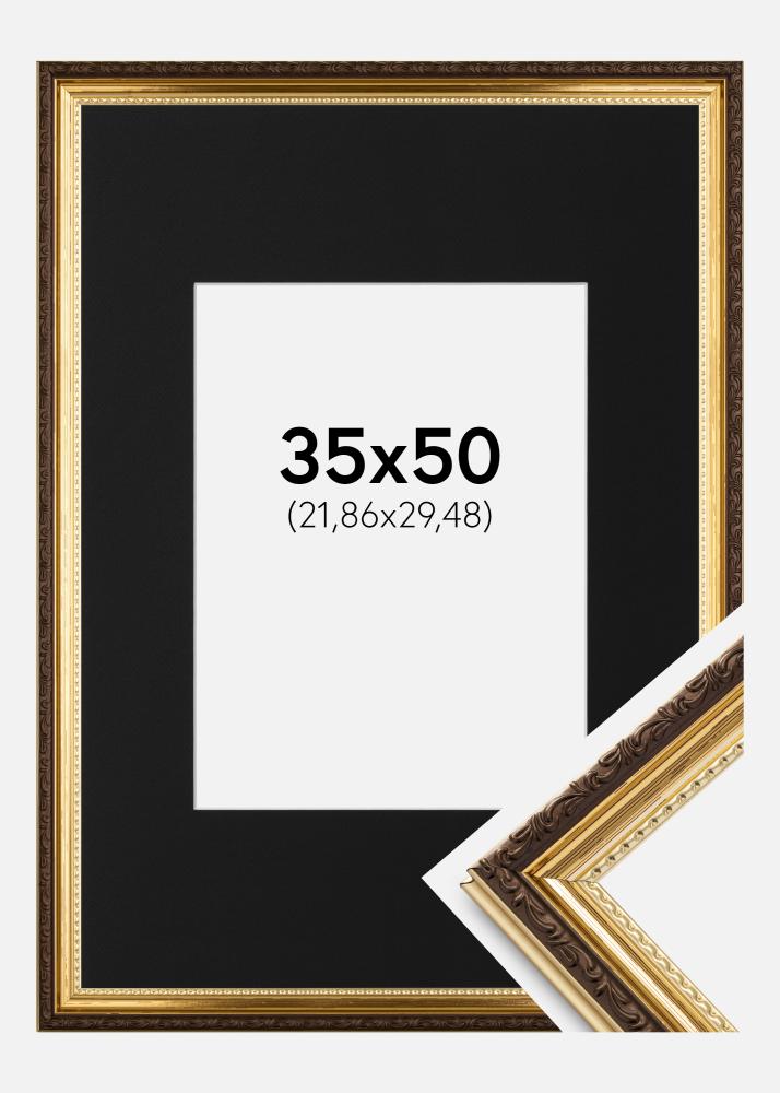 Pakket met een kader en bijpassend zwart passe-partout. In de productafbeelding staan de maten van het kader (vetgedrukt) en de binnenmaten van het passe-partout (aangegeven tussen haakjes). Let op; de binnenmaat van het passe-partout dient altijd 1 cm kleiner te zijn dan de afmetingen van de gewenste afbeelding.