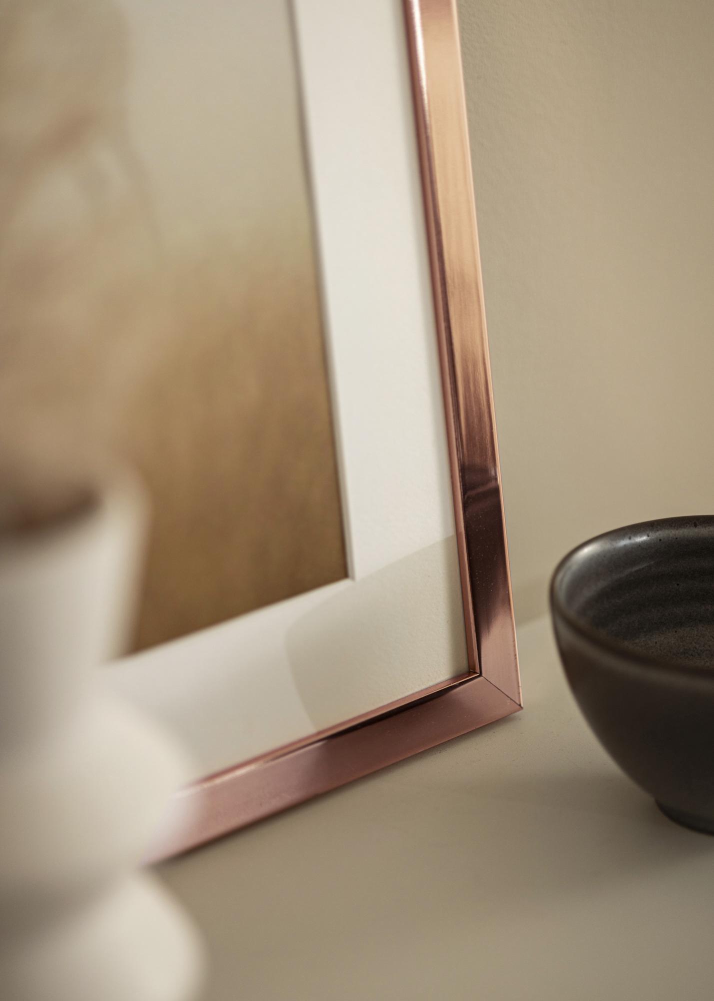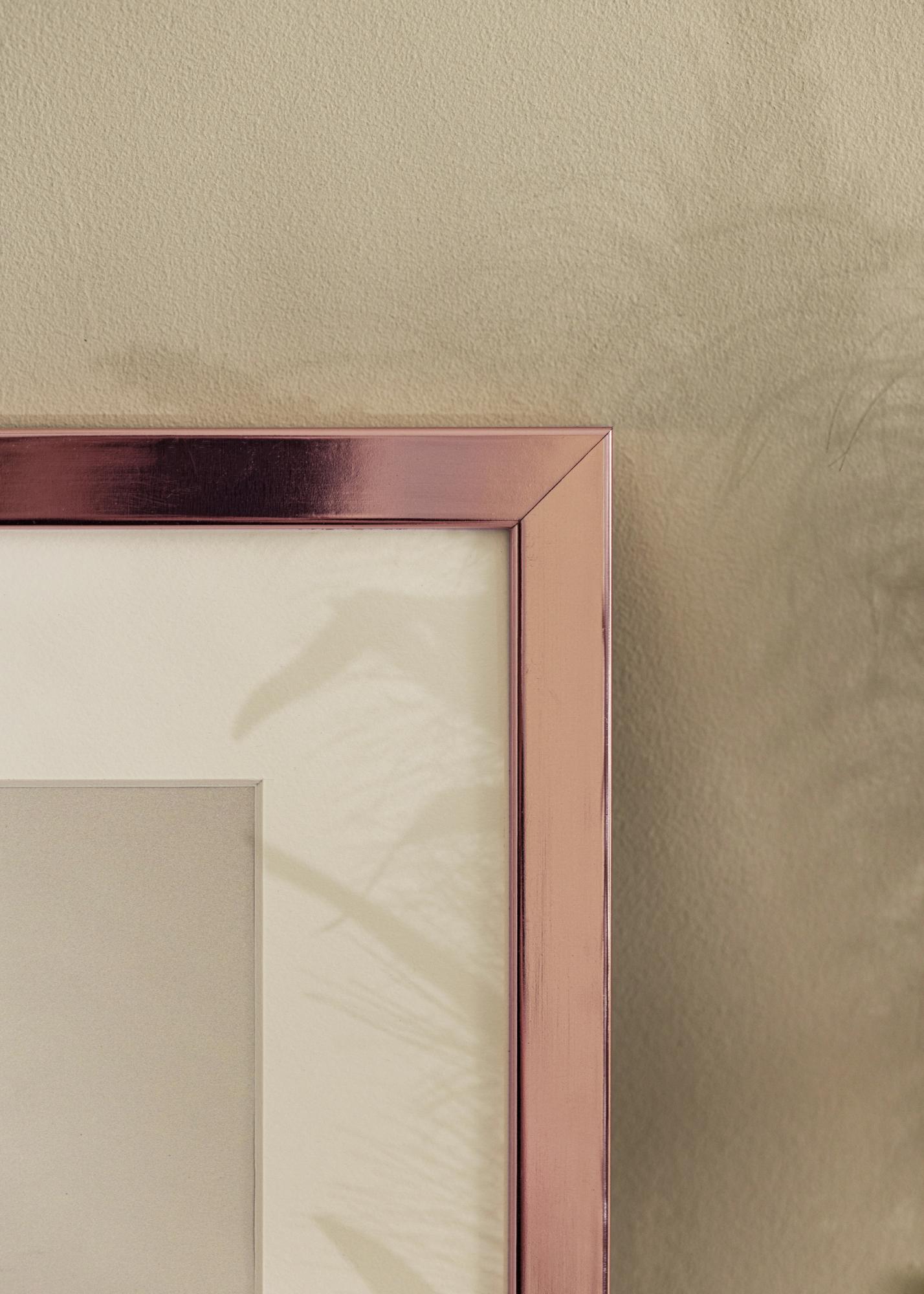 De roségouden afwerking geeft een luxueus gevoel en het metallic oppervlak heeft een zachte glans die subtiele variaties in kleurdiepte creëert, afhankelijk van de hoek van het licht. Dit zorgt ervoor dat het kader niet alleen uw foto aanvult, maar ook deel uitmaakt van het interieur van uw huis.