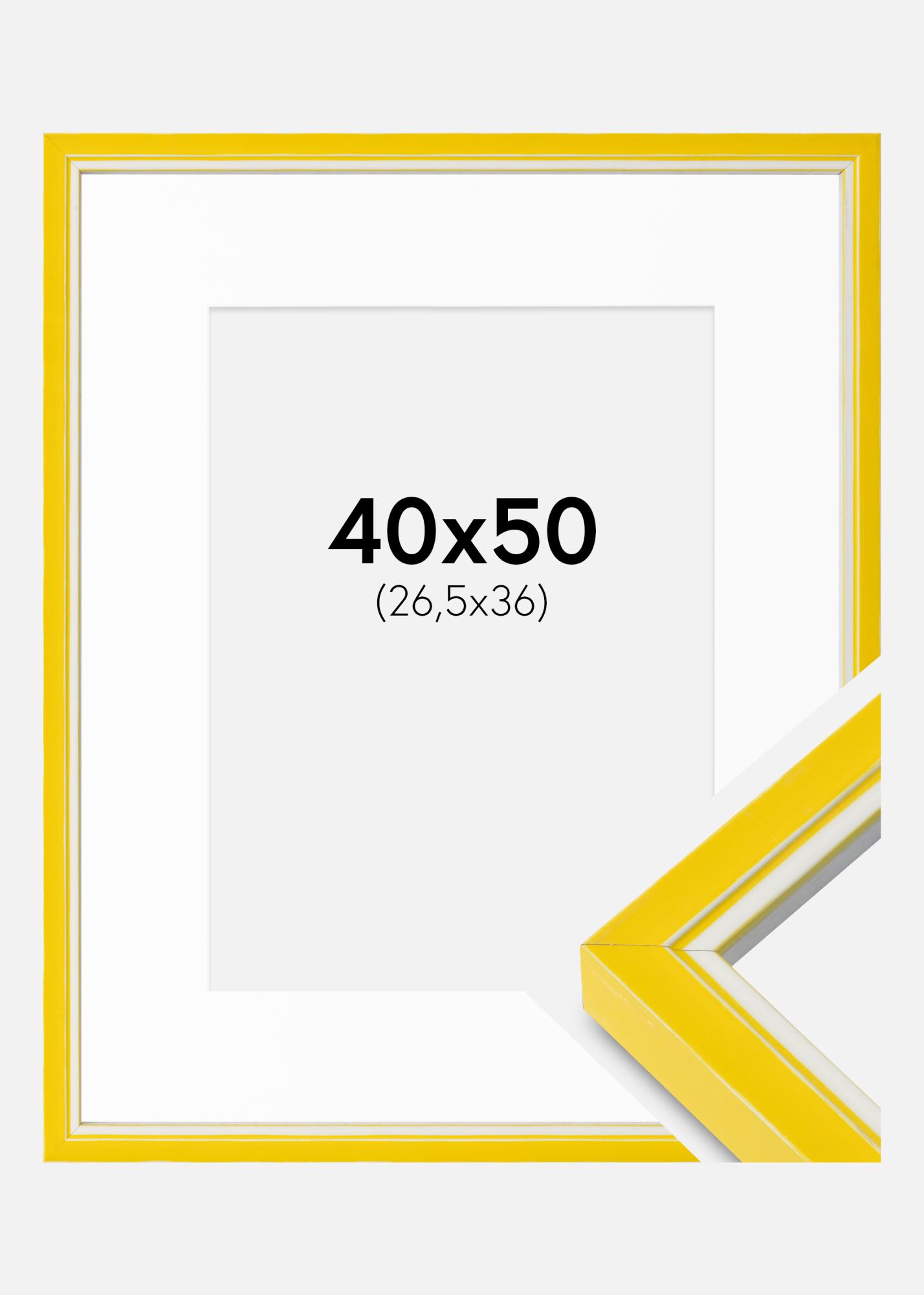 Transformeer je foto's tot kunstwerken met ons elegante kader in een levendige gele tint. Dit kader is ontworpen om foto's van 27,5x37 cm te passen en heeft totale buitenafmetingen van 43x53 cm. Met een breedte van 20 mm en een diepte van 32 mm biedt het kader een robuuste en stijlvolle omlijsting die je favoriete motieven benadrukt.