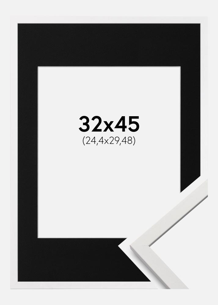 Pakket met een kader en bijpassend zwart passe-partout. In de productafbeelding staan de maten van het kader (vetgedrukt) en de binnenmaten van het passe-partout (aangegeven tussen haakjes). Let op; de binnenmaat van het passe-partout dient altijd 1 cm kleiner te zijn dan de afmetingen van de gewenste afbeelding.