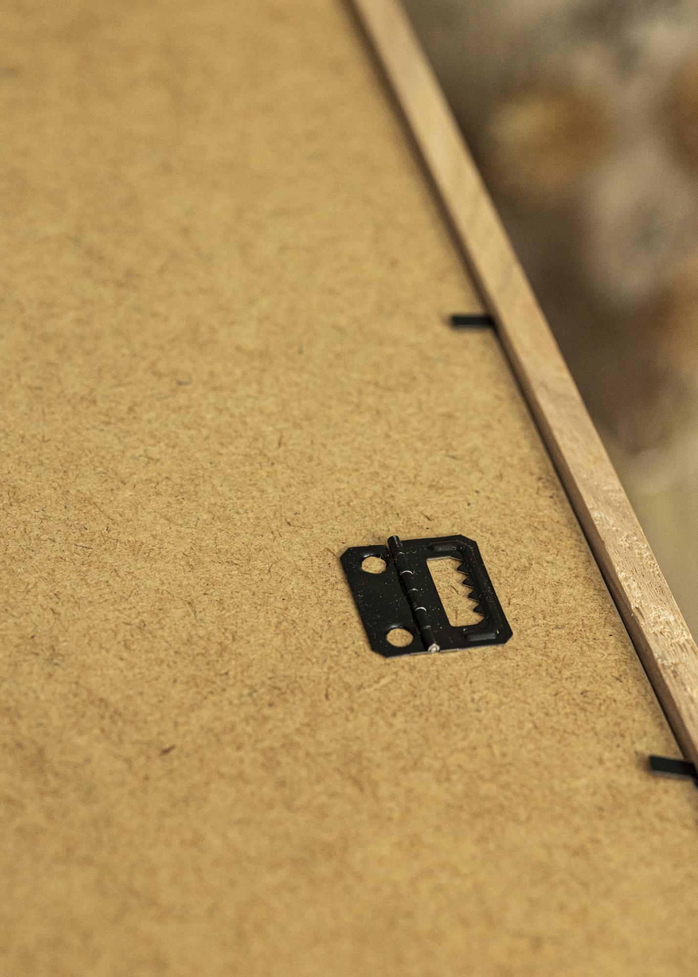 De achterkant is gemaakt van MDF-materiaal en wordt op zijn plaats gehouden door kleine buigbare pinnen. Afbeeldingen kunnen eenvoudig in het frame geplaatst worden door de flexibele pinnen omhoog te buigen, waardoor de achterkant los gemaakt kan worden. Het kader kan zowel staand als liggend aan de muur worden bevestigd.