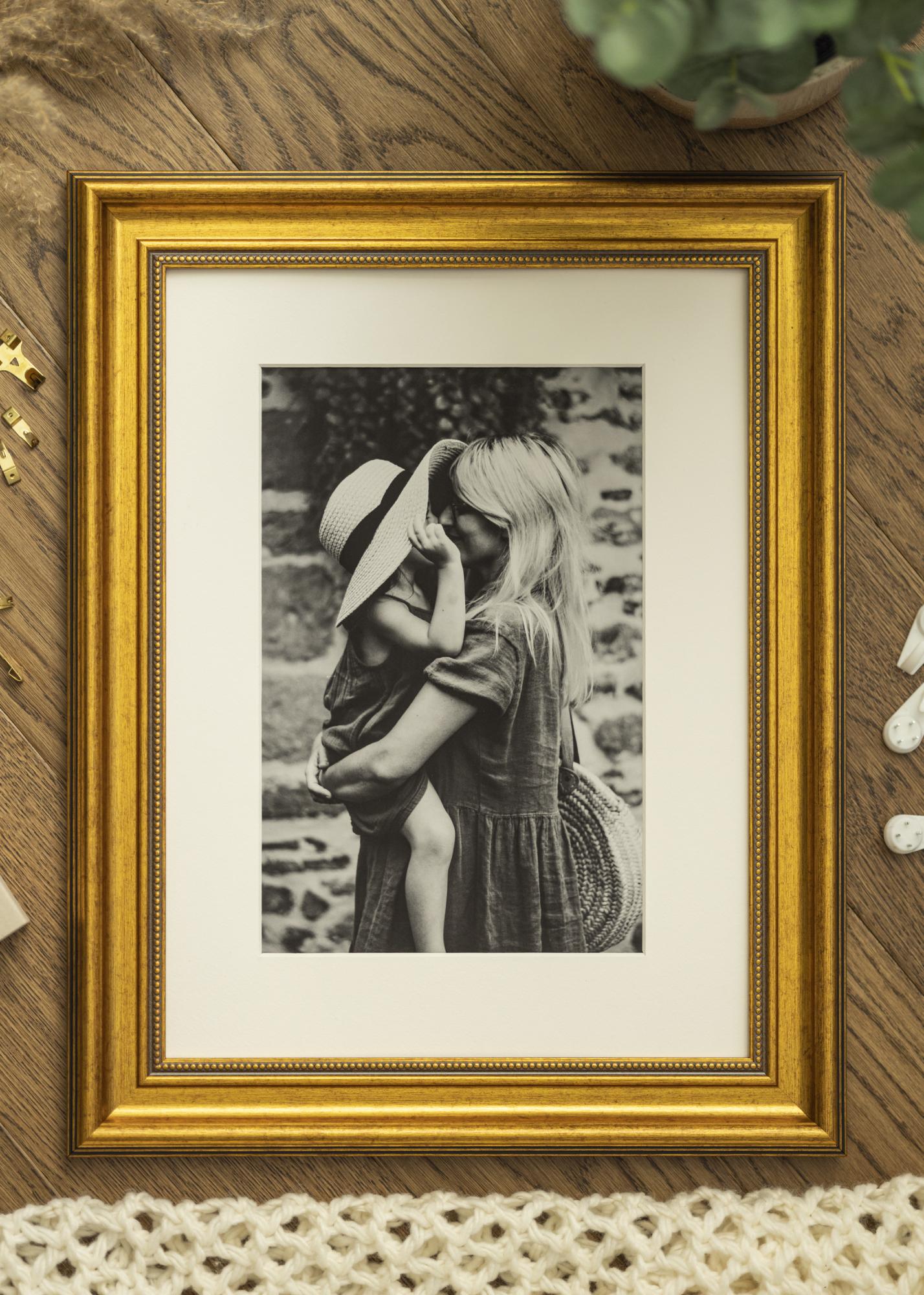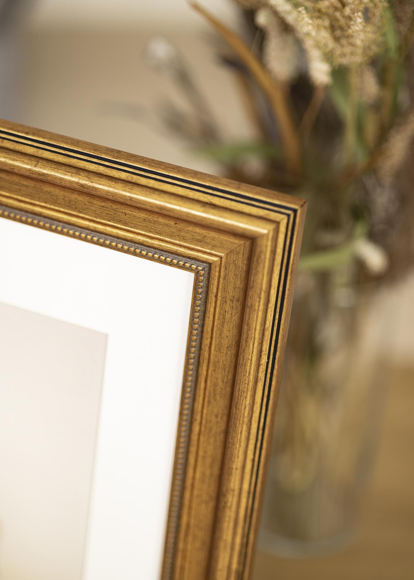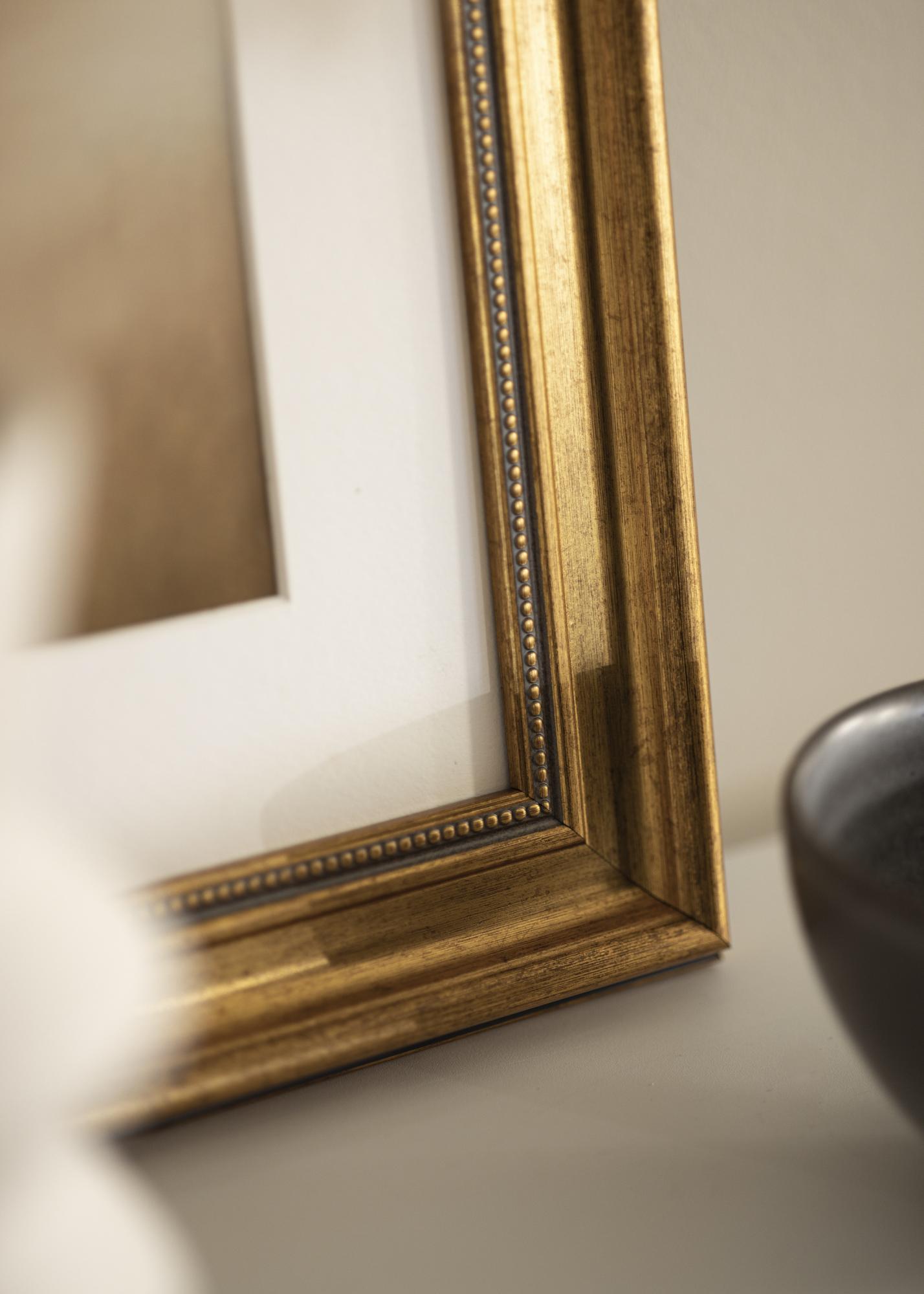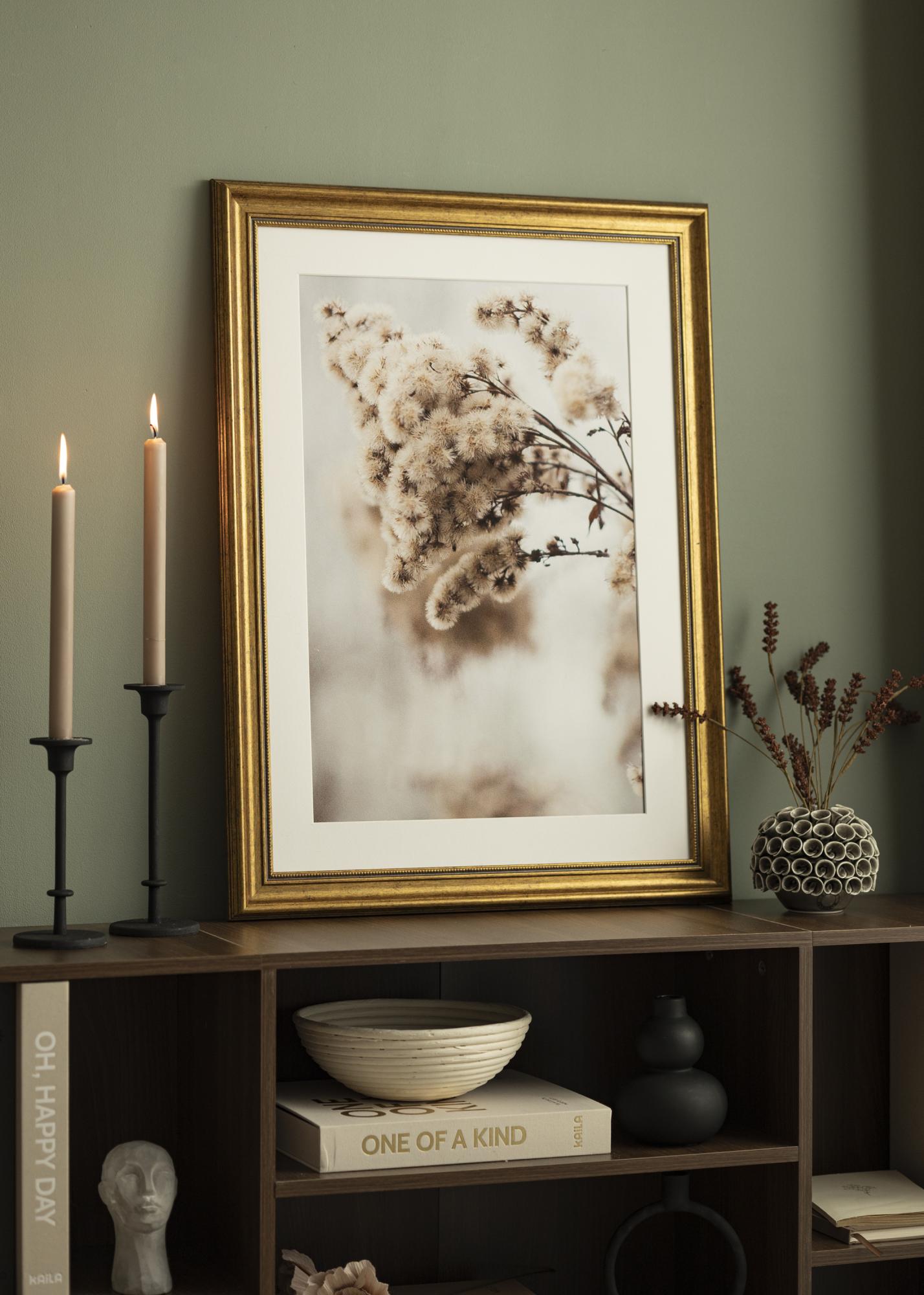 Rococo is een gouden lijst die een heerlijk vintage gevoel geeft aan al je favoriete afbeeldingen. De lijst heeft een 50 mm brede lijstrand in de tint van glanzend antiekgoud, en een prachtig versleten oppervlak dat het klassieke uiterlijk van de lijst versterkt. De lijst is geschikt voor persoonlijke foto's evenals voor abstracte posters – en ongeacht welk motief je kiest, je kunt het zonder problemen monteren. Maak gewoon de achterkant van de lijst los, die op zijn plaats wordt gehouden door kleine buigbare pinnen, en plaats dan je muurkunst tegen het glas van de lijst.