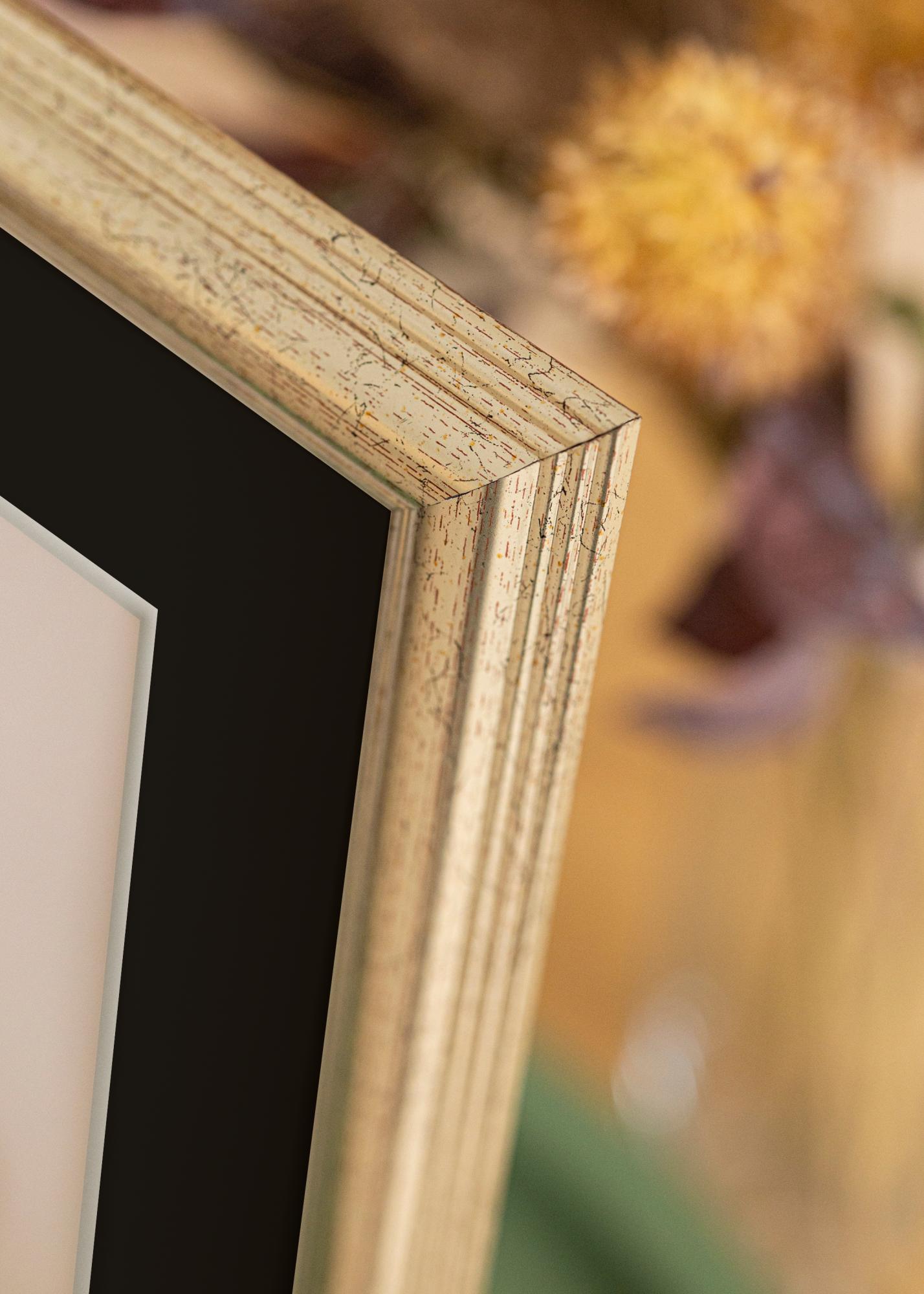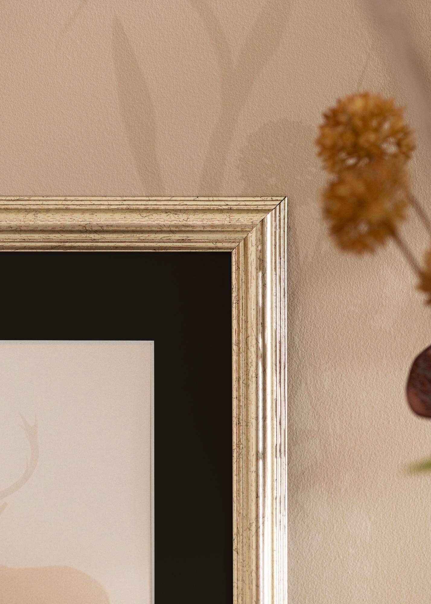 Pakket met een kader en bijpassend zwart passe-partout. In de productafbeelding staan de maten van het kader (vetgedrukt) en de binnenmaten van het passe-partout (aangegeven tussen haakjes). Let op; de binnenmaat van het passe-partout dient altijd 1 cm kleiner te zijn dan de afmetingen van de gewenste afbeelding.