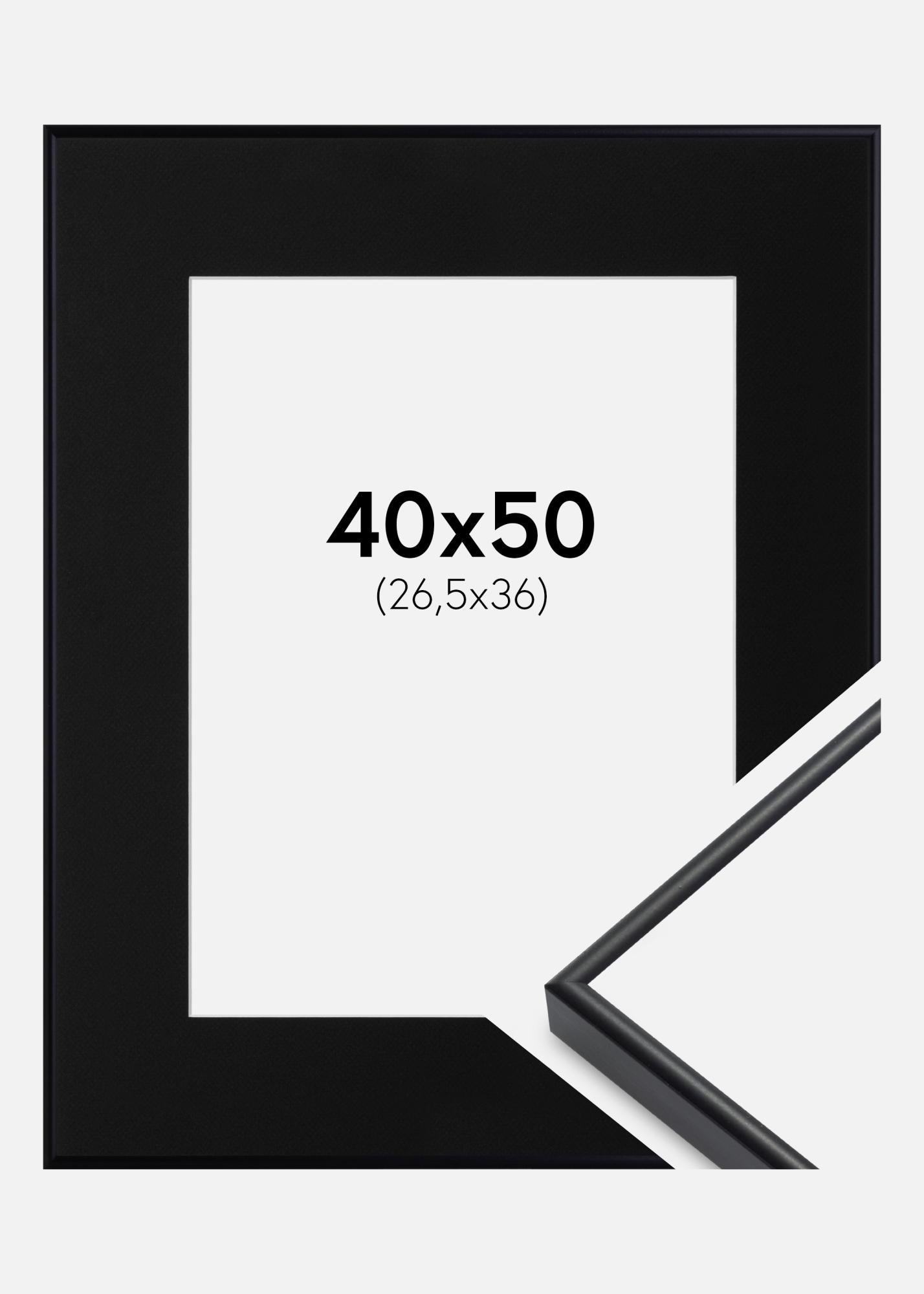 Pakket met een kader en bijpassend zwart passe-partout. In de productafbeelding staan de maten van het kader (vetgedrukt) en de binnenmaten van het passe-partout (aangegeven tussen haakjes). Let op; de binnenmaat van het passe-partout dient altijd 1 cm kleiner te zijn dan de afmetingen van de gewenste afbeelding.