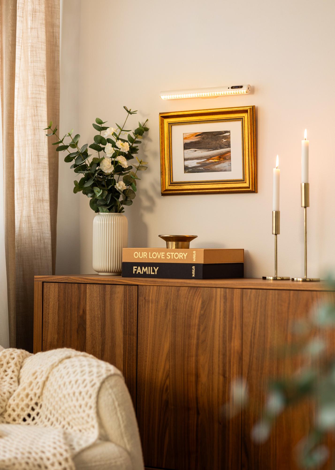 KAILA Illuminate is een stijlvolle en batterijgevoede schilderijverlichting in witte afwerking, perfect om je schilderijen te accentueren zonder storende kabels. Het draadloze ontwerp maakt de montage eenvoudig en flexibel, zonder dat je rekening hoeft te houden met stopcontacten. De elegante witte kleur geeft een moderne en discrete uitstraling die in verschillende interieurstijlen past, terwijl het gelijkmatige licht de details en kleuren van je kunst benadrukt. Eenvoudig te installeren en te gebruiken – een praktische en handige oplossing voor je muurkunst.