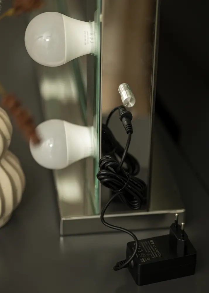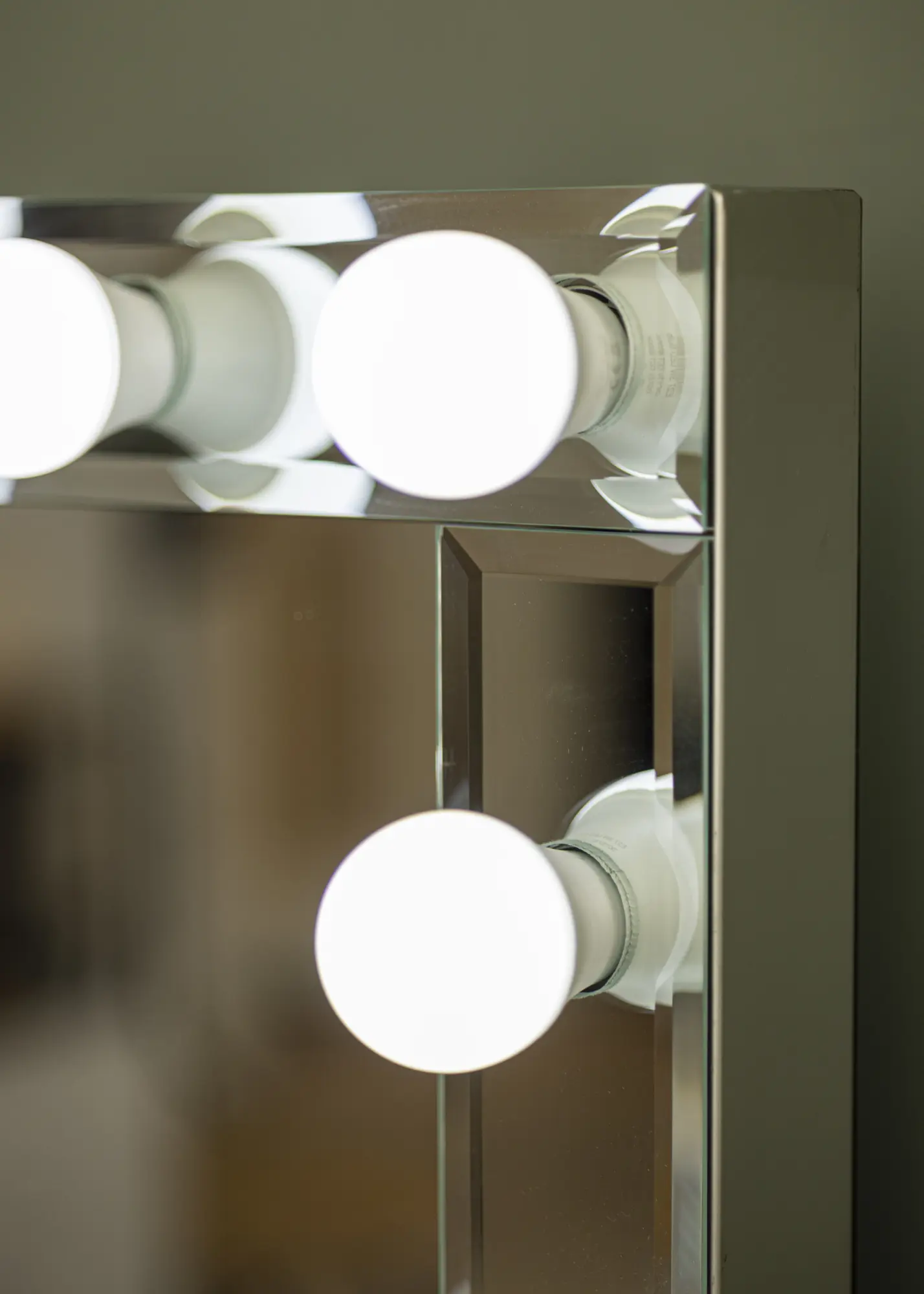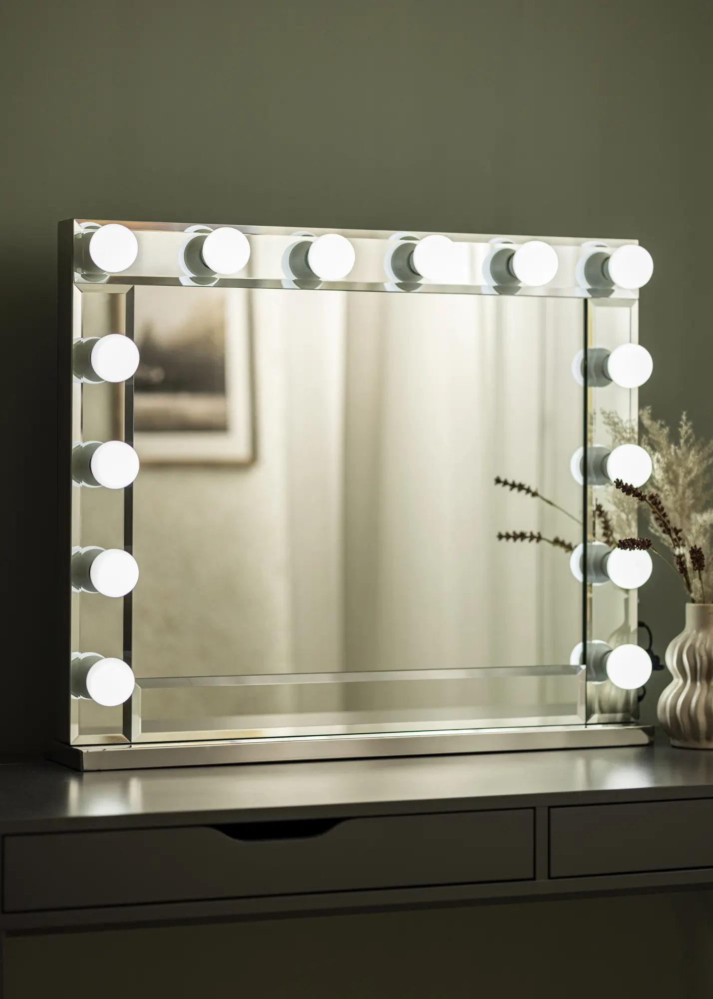 Voeg een zilveren randje toe aan je huis met deze Hollywood design make-up spiegel. De spiegel heeft een zilverkleurig frame en is omkadert met 14 gloeilampen, wat de spiegel een mooie luxe uitstraling geeft. De lampen zijn vervangbaar en hebben een E27-fitting. De lampen geven een koele witte gloed. Je kunt de verlichting dimmen tot een helderheid die bij de gelegenheid past, een heldere verlichting is ideaal wanneer je je gaat opmaken, terwijl een meer gedimde gloed de voorkeur heeft als achtergrondverlichting. Je kan de verlichting aanpassen via een draaiknop aan de zijkant van de spiegel.