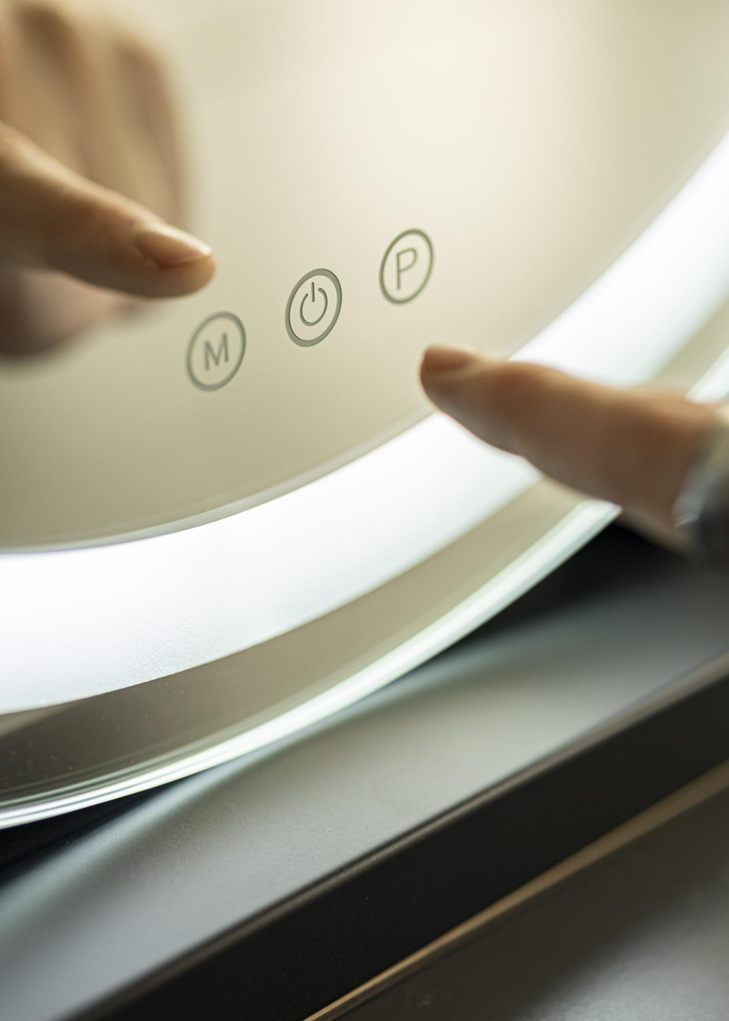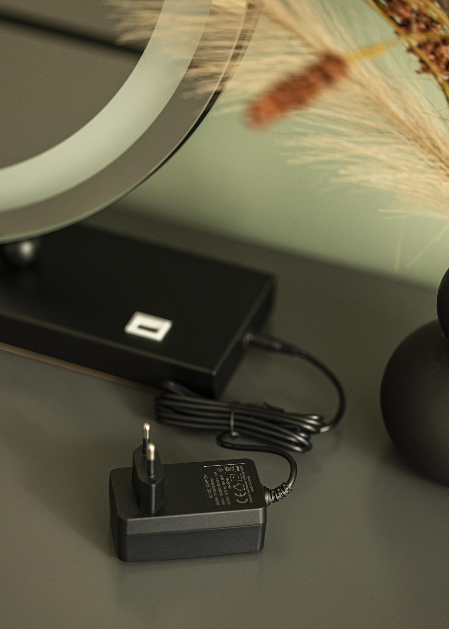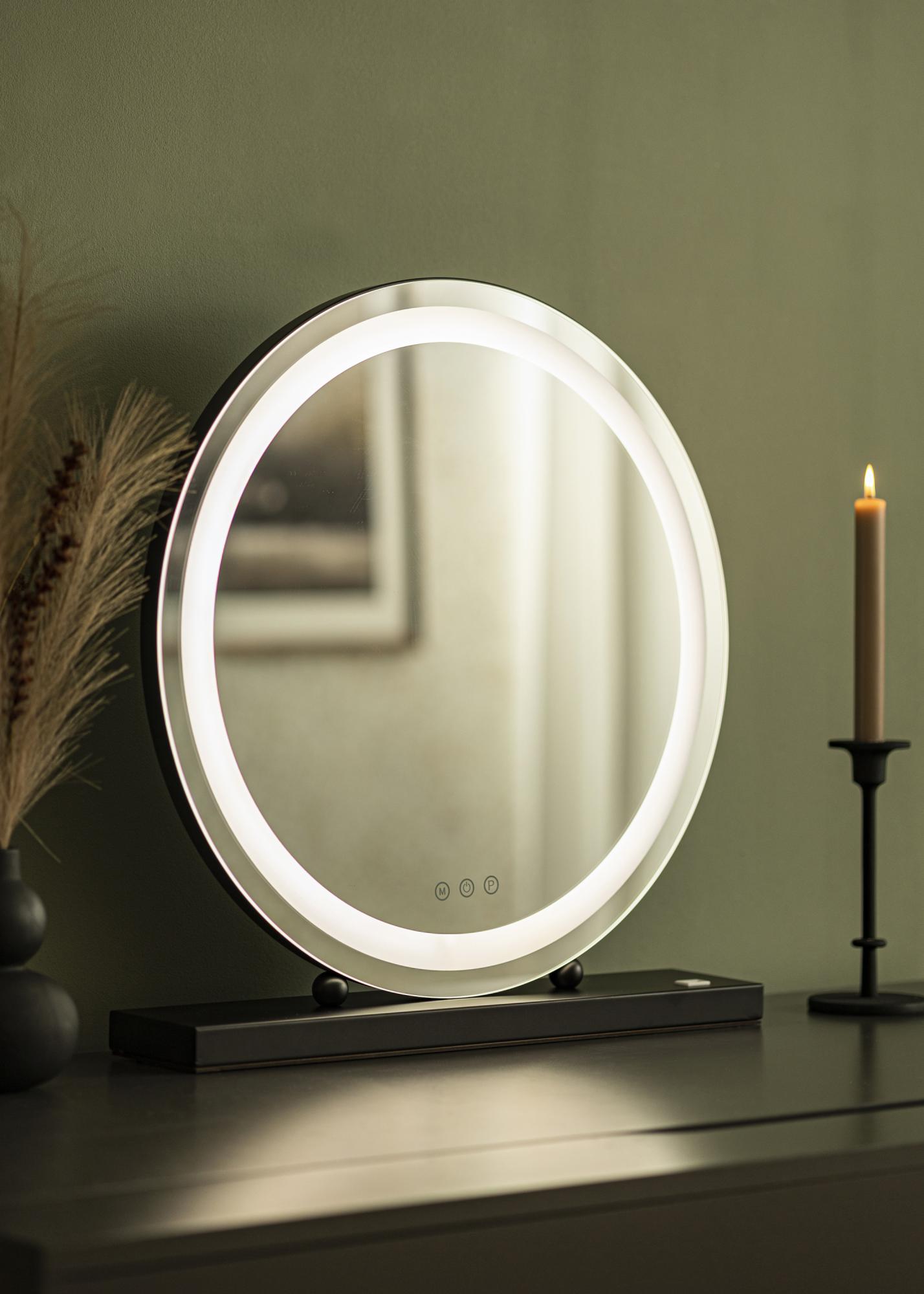 Dit is een make-up spiegel in staande positie, met een voetsteun in een prachtige neutrale zwarte kleur die gemakkelijk kan worden gecombineerd met de rest van het interieur. De spiegel heeft een klassieke ronde vorm met een diameter van 50 cm, die prachtig wordt omkadert door geïntegreerde LED-verlichting. Er zitten drie touch knoppen aan de onderkant van de spiegel. Met de "M" knop kun je de kleurtemperatuur aanpassen, met de "P" knop kan het licht worden gedimd naar de gewenste lichtsterkte en er is een aparte knop om het licht in of uit te schakelen. Elektrische aansluiting wordt gemaakt door middel van een stekker.