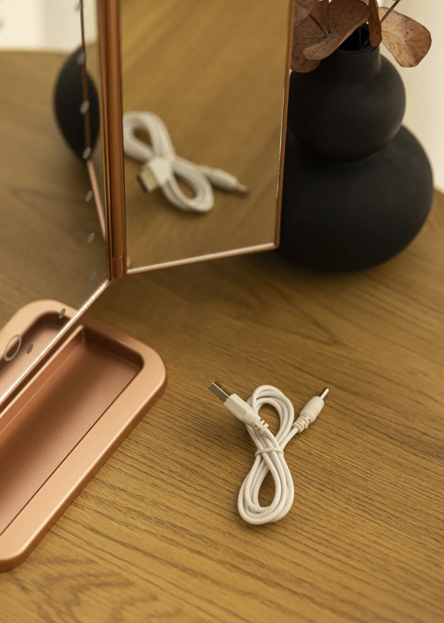 De spiegel heeft een staand design en is uitgevoerd in trendy roségoud. De zijkanten van de spiegel kunnen worden ingevouwen, waardoor je de zijkanten in de juiste positie kunt zetten bij gebruik. Om een goede close-up van je gezicht te kunnen maken is de spiegel uitgevoerd met 2x, 3x en 10x zoom. De zones met zoomfunctie bevinden zich op de kleinere zijspiegels van de spiegel.