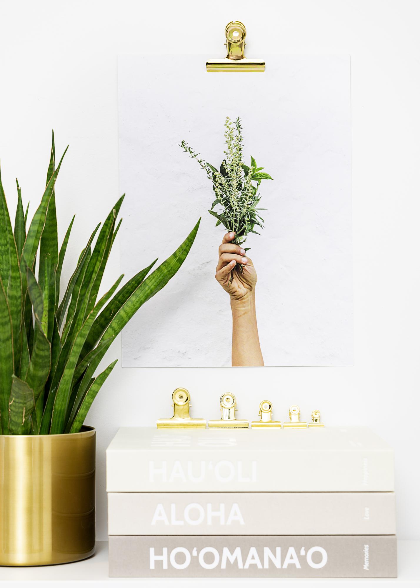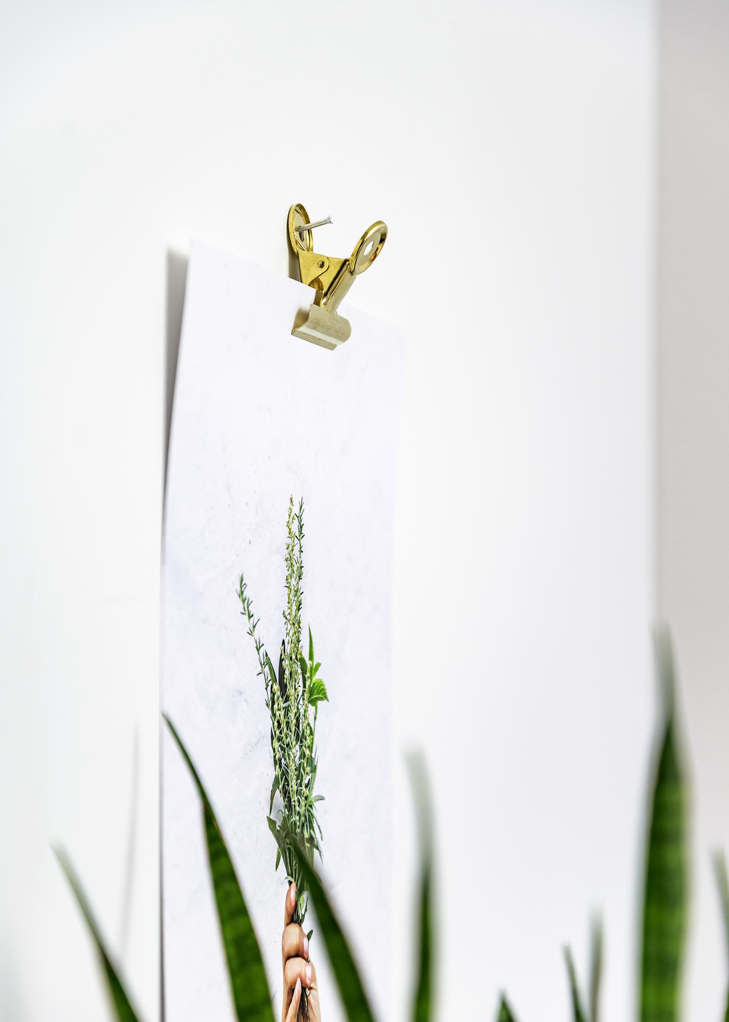 Een metalen clip met een elegante, glanzend gouden finish. Geef je posters en prints een trendy, minimalistische look. De poster clip heeft een stijlvol design en door de gaatjes in de ronde bovenkant van de clip is deze eenvoudig met een spijker of schroef aan de muur te bevestigen. De opening van de clip heeft een stevige grip waarmee je het dunste papier kunt ophangen, maar is tevens geschikt voor prints met grotere diktes. Als je een grote poster wilt ophangen, gebruik dan twee metalen clips voor het beste resultaat.