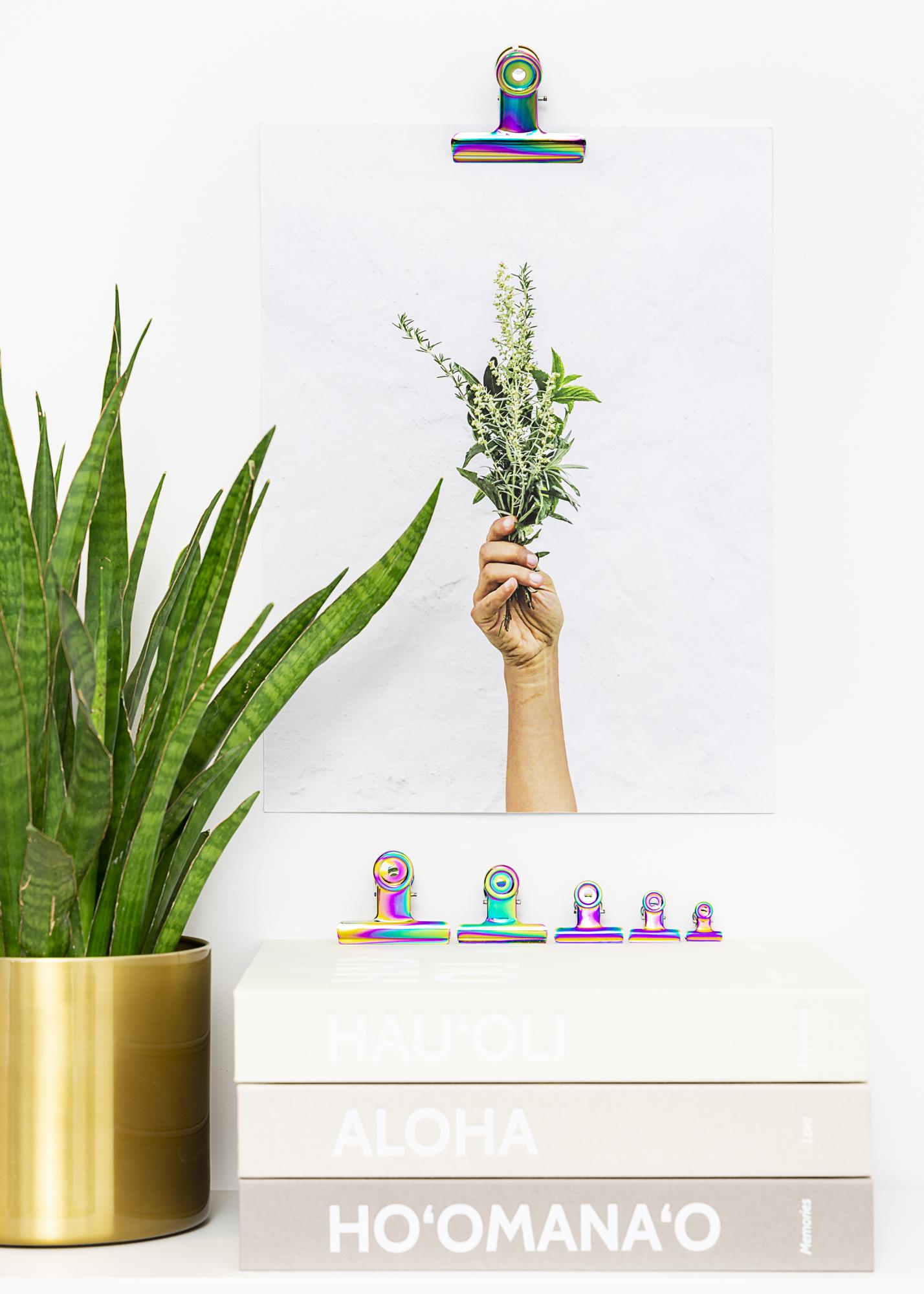 Een fraaie metalen clip in de kleuren van de regenboog en met blanke finish geeft je posters en prints een trendy, minimalistische look. De opening van de clip heeft een flexibele maar stevige grip waarmee je zowel superdun papier als prints van een grotere dikte kunt bevestigen. En als je een grote poster hebt, gebruik dan twee metalen clips. De stijlvolle clip heeft gaten in de bovenkant en is daarom eenvoudig met een spijker of schroef aan de muur te bevestigen.