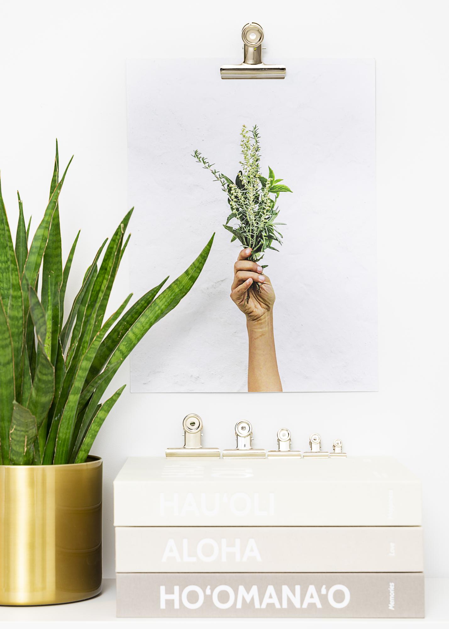 Deze metalen clip heeft een moderne, glanzend zilveren finish en geeft je posters en prints een trendy, minimalistische look. Dankzij de flexibele, stevige grip kun je motieven van verschillende diktes ophangen, zelfs het dunste papier. En als je een grote poster hebt, gebruik dan twee metalen clips. Het ontwerp van de poster clip is stijlvol minimalistisch en de gaten in de ronde bovenkant maken het ophangen aan de muur eenvoudig - alles wat je nodig hebt is een kleine spijker of schroef.