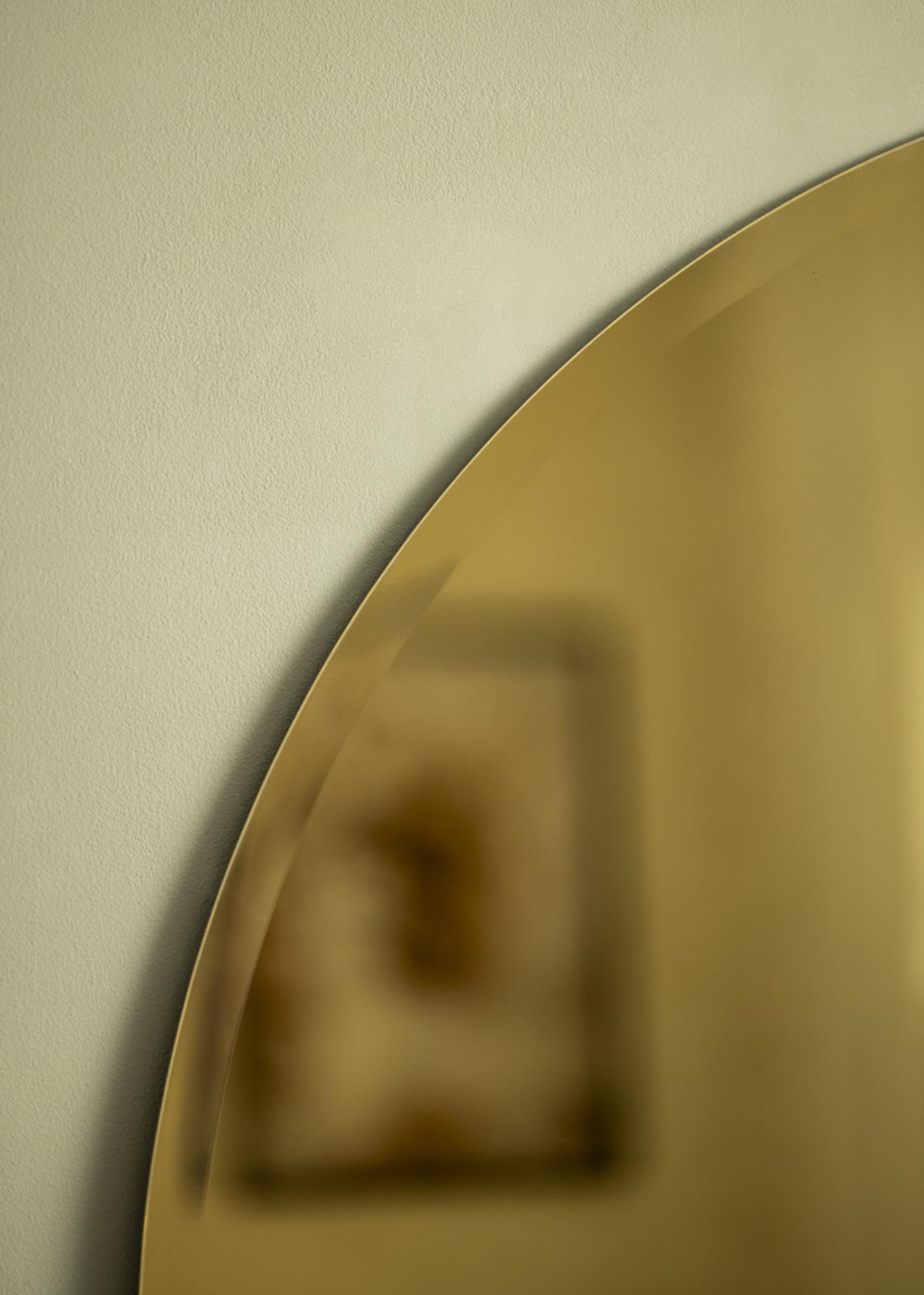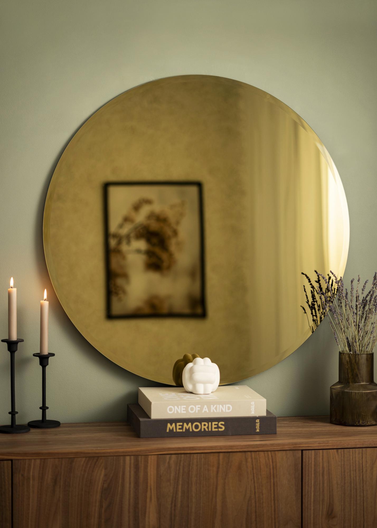 Voeg een gouden randje toe aan je huis met Gold Deluxe! Deze wandspiegel heeft een zachte ronde vorm en heeft prachtig goudgekleurd spiegelglas. Om het gevoel van luxe nog meer te versterken, heeft de spiegel een elegant geslepen facetrand, een prachtige afgeschuinde rand rondom de spiegel.