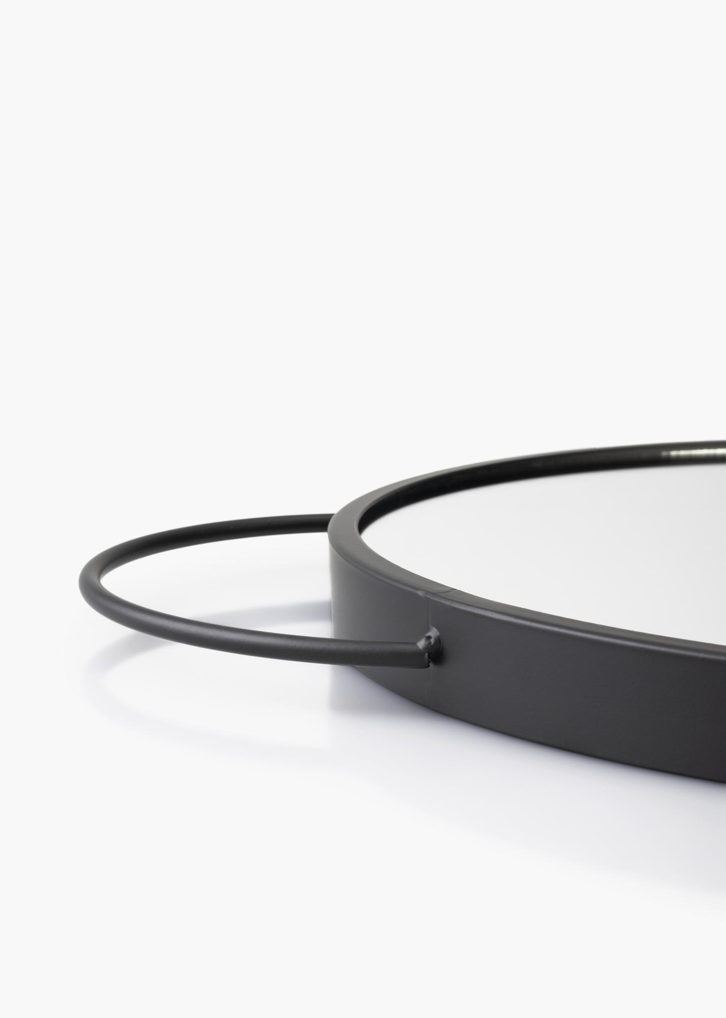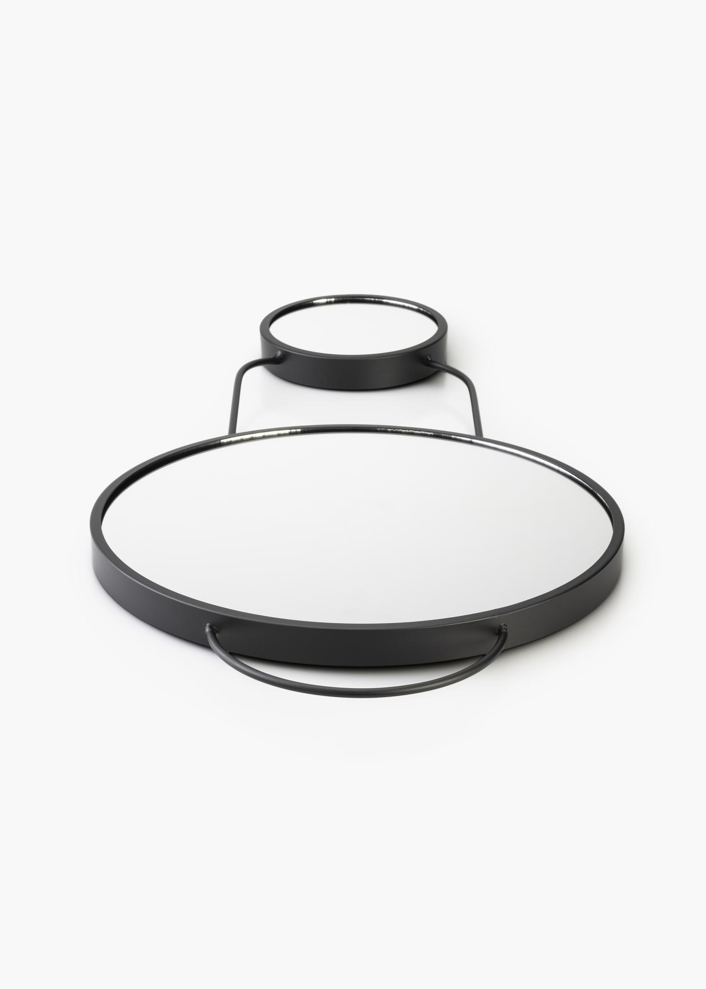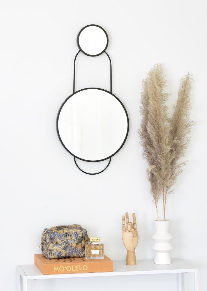 Dit is een opvallende KAILA wandspiegel met twee spiegels gecombineerd in één, een uniek en stijlvol design. De wandspiegel heeft een kleinere spiegel aan de bovenkant en een grotere aan de onderkant. De spiegel meet 35x71 cm en is gemaakt van metaal. De spiegel heeft een moderne, stijlvolle, zwarte kleur.