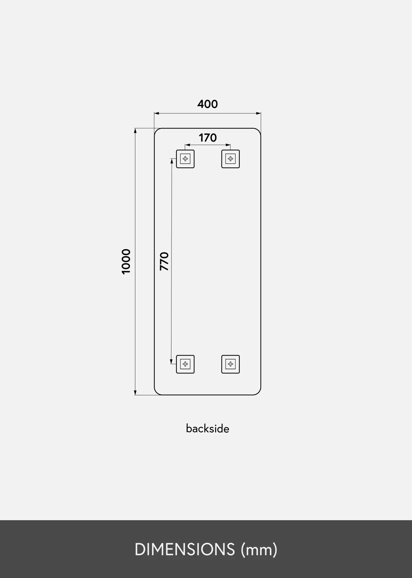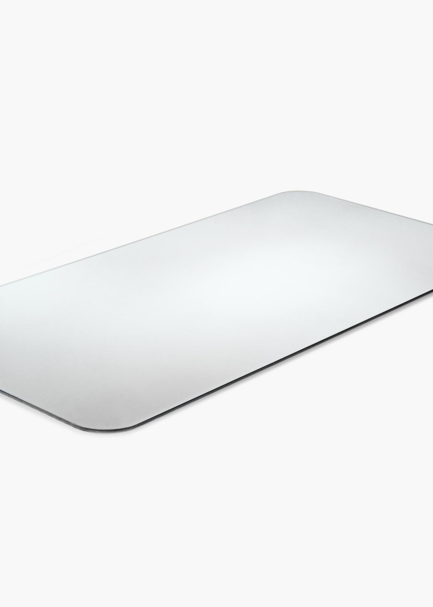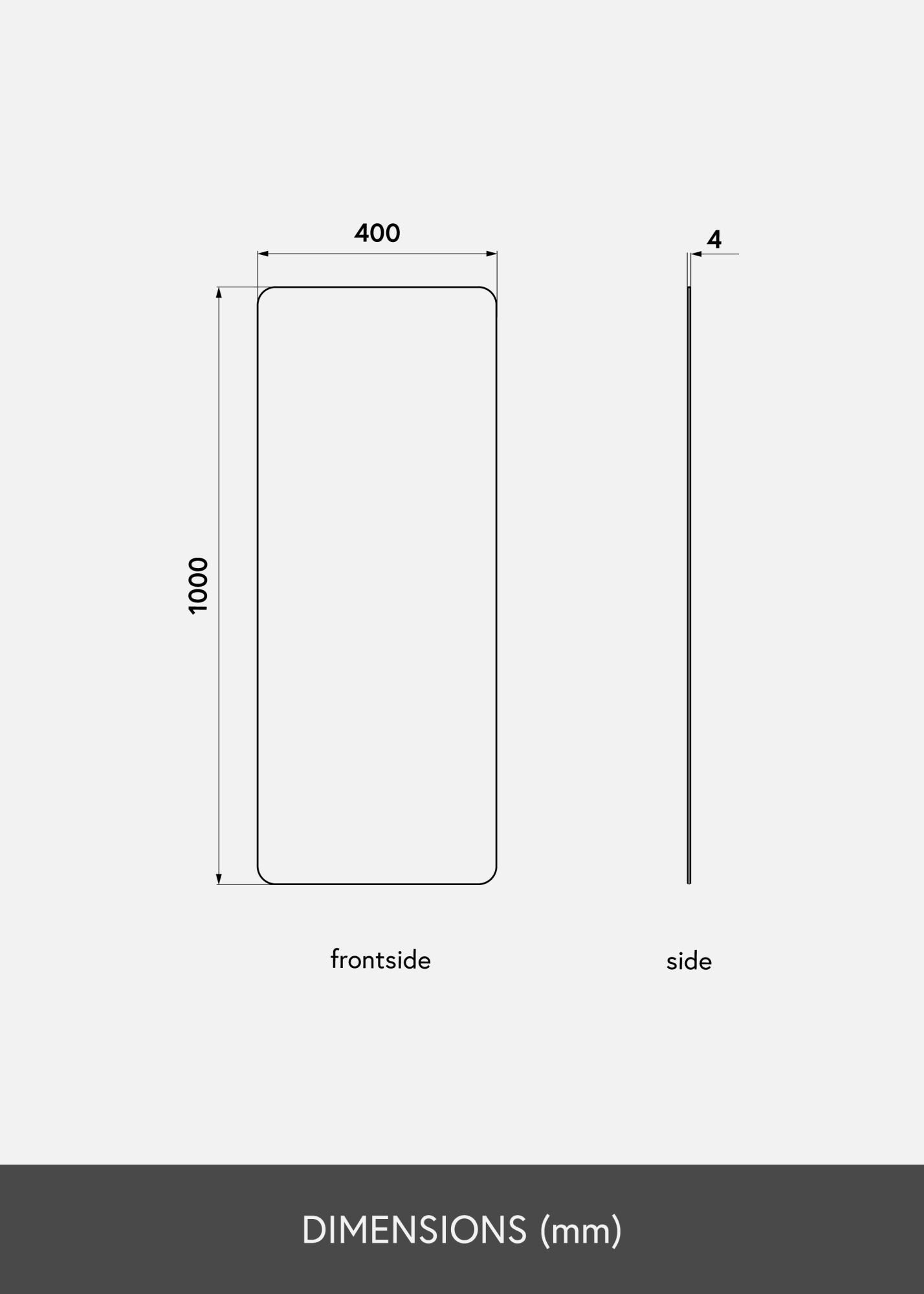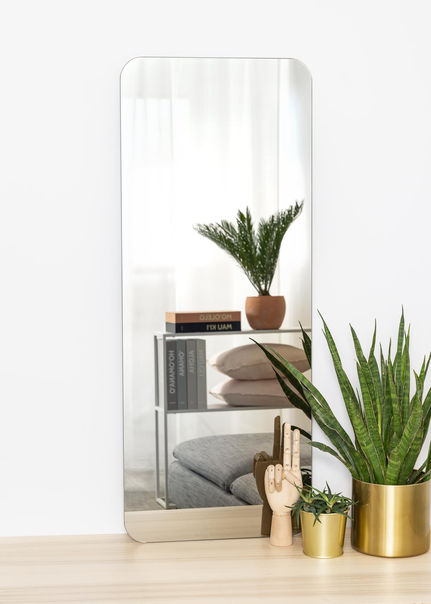 Deze rechthoekige spiegel heeft decoratieve, afgeronde hoeken wat voor een zachtere indruk zorgt en een gevoel van elegantie toevoegt. De spiegel is slechts 4 mm dun en is niet voorzien van een lijst, wat hem een stijlvolle en minimalistische uitstraling geeft.
