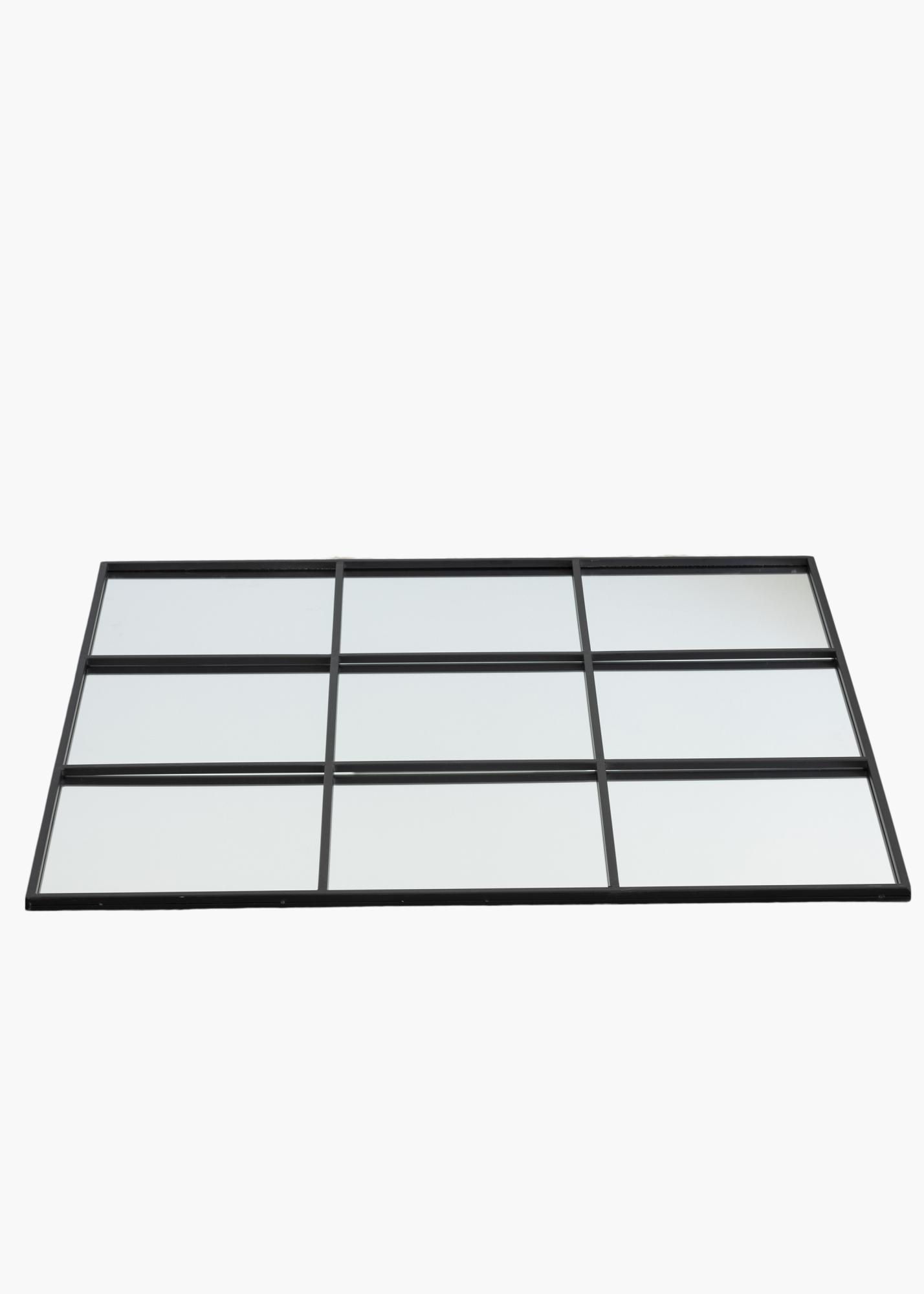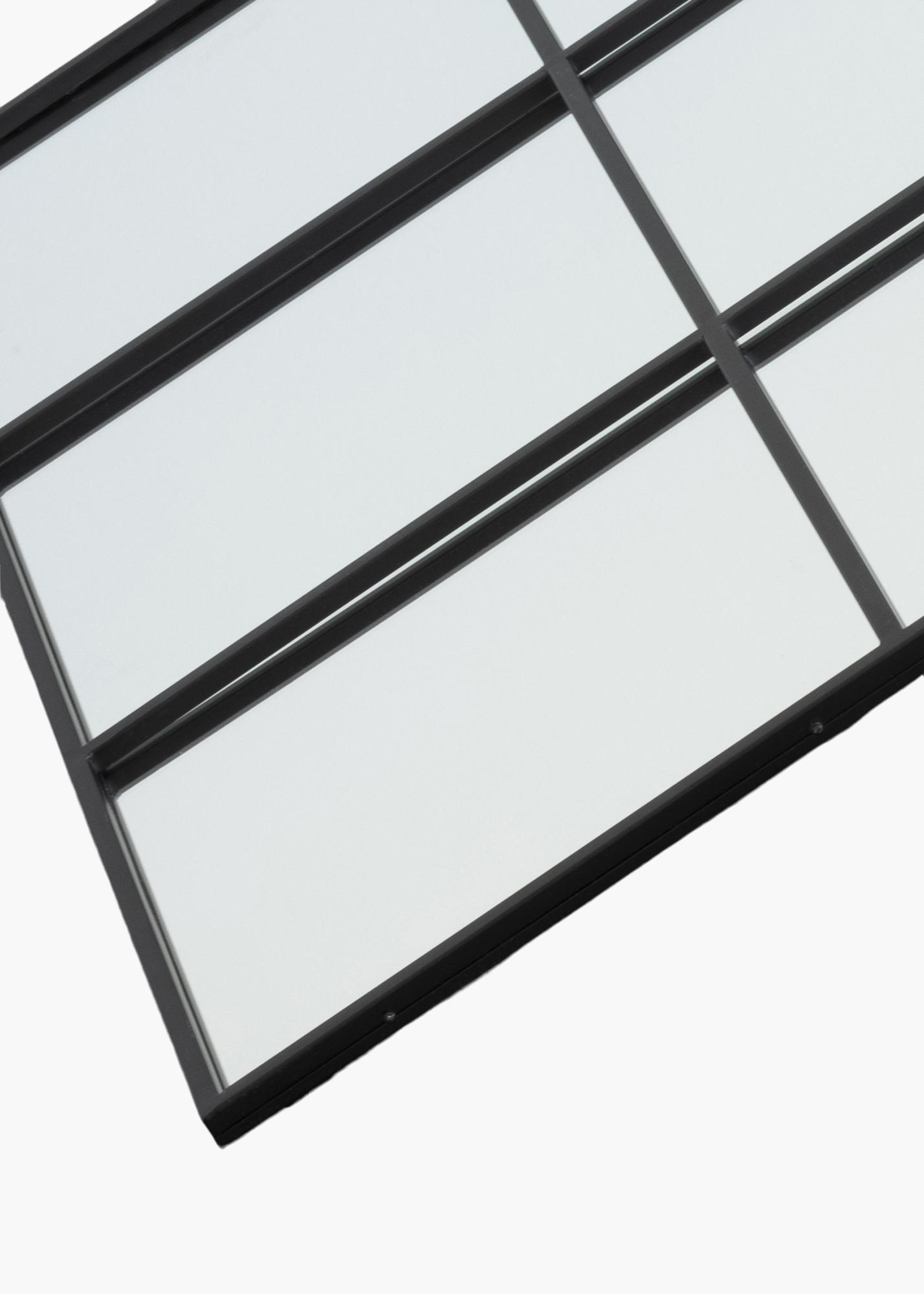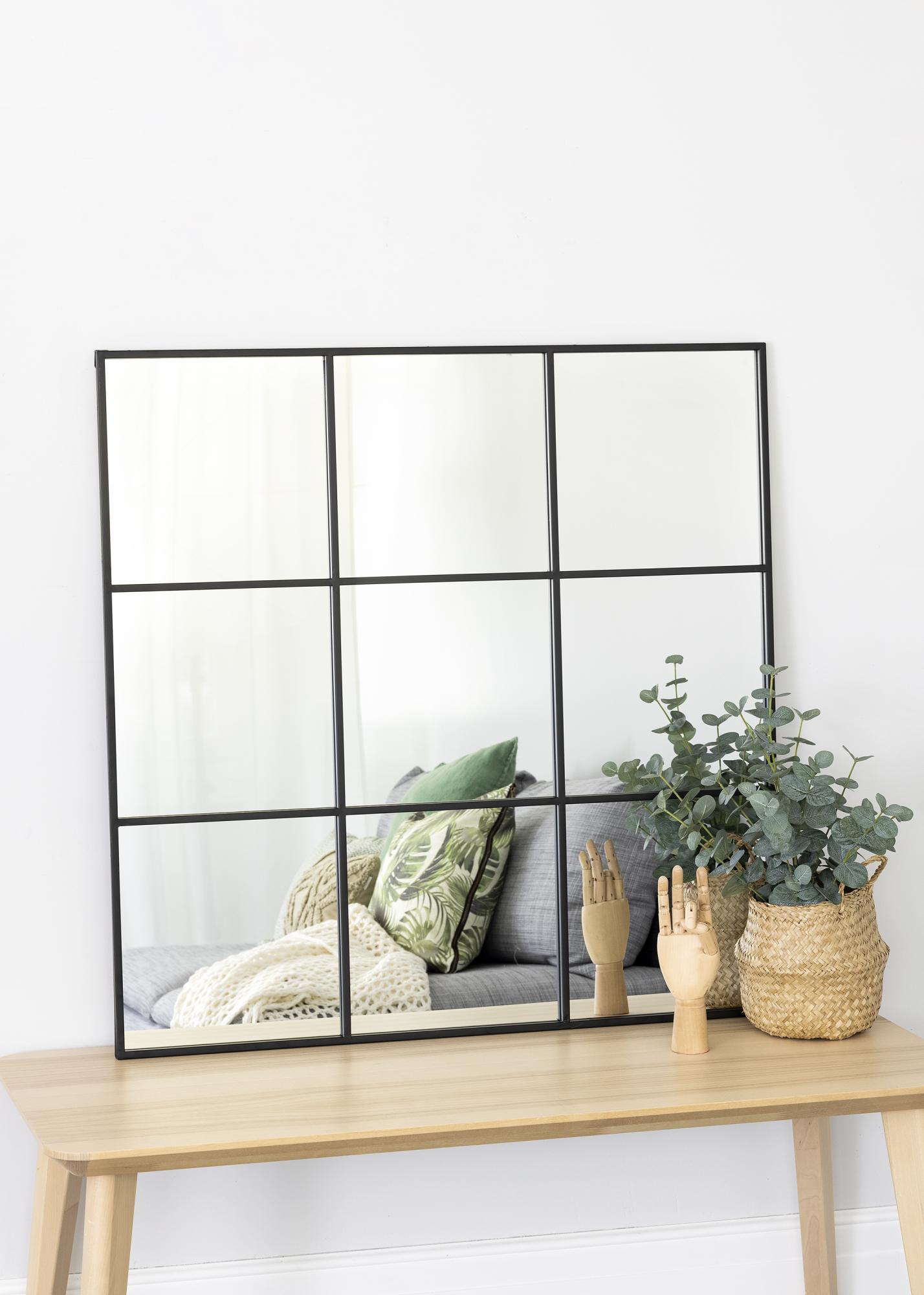 Dit is een vierkante spiegel met een stijlvol roosterpatroon. De ramen zijn stijlvol omlijst door zwarte dunne metalen lijnen die deze wandspiegel een rustiek en industrieel karakter geven. De vierkante vorm geeft de spiegel een elegante uitstraling. Plaats deze spiegel in bijvoorbeeld de gang, keuken of slaapkamer om meer ruimte in de kamer te creëren en tegelijkertijd een decoratief interieurdetail te krijgen. Muurbevestiging is beschikbaar. De spiegel meet 90x90 cm.