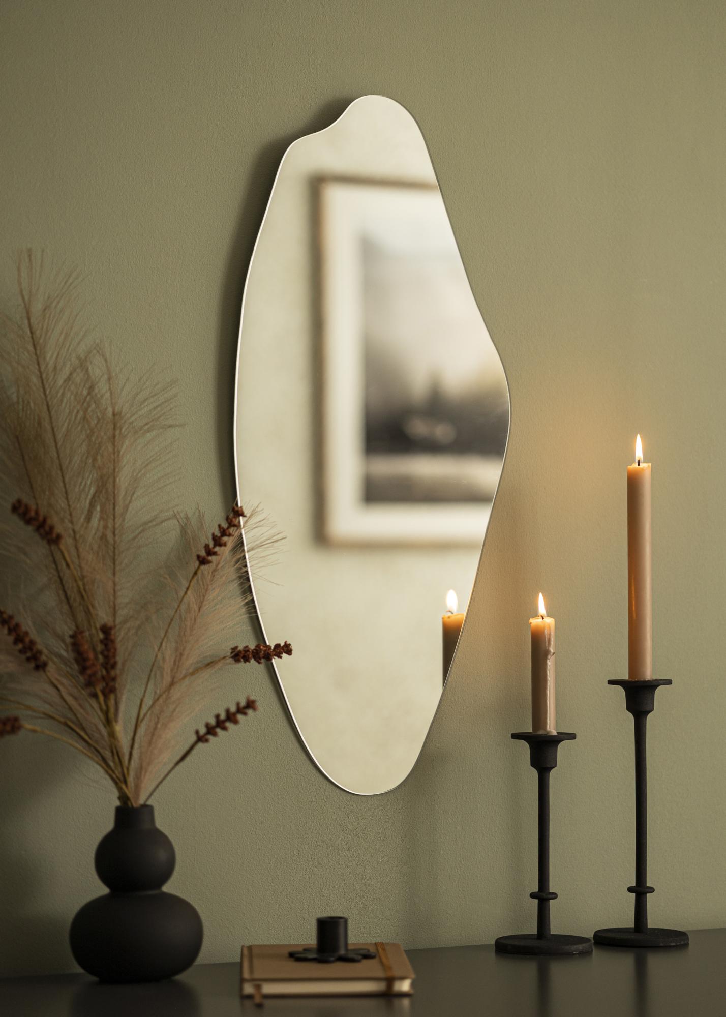 Dit is een langwerpige wandspiegel met een prachtige asymmetrische vorm, waardoor het een spannend interieurdetail is dat perfect in het moderne huis past. Met de praktische wandbevestiging aan de achterkant kan de spiegel aan de muur van elke gewenste kamer kan worden opgehangen. Het is zelfs geschikt voor gebruik in de badkamer!