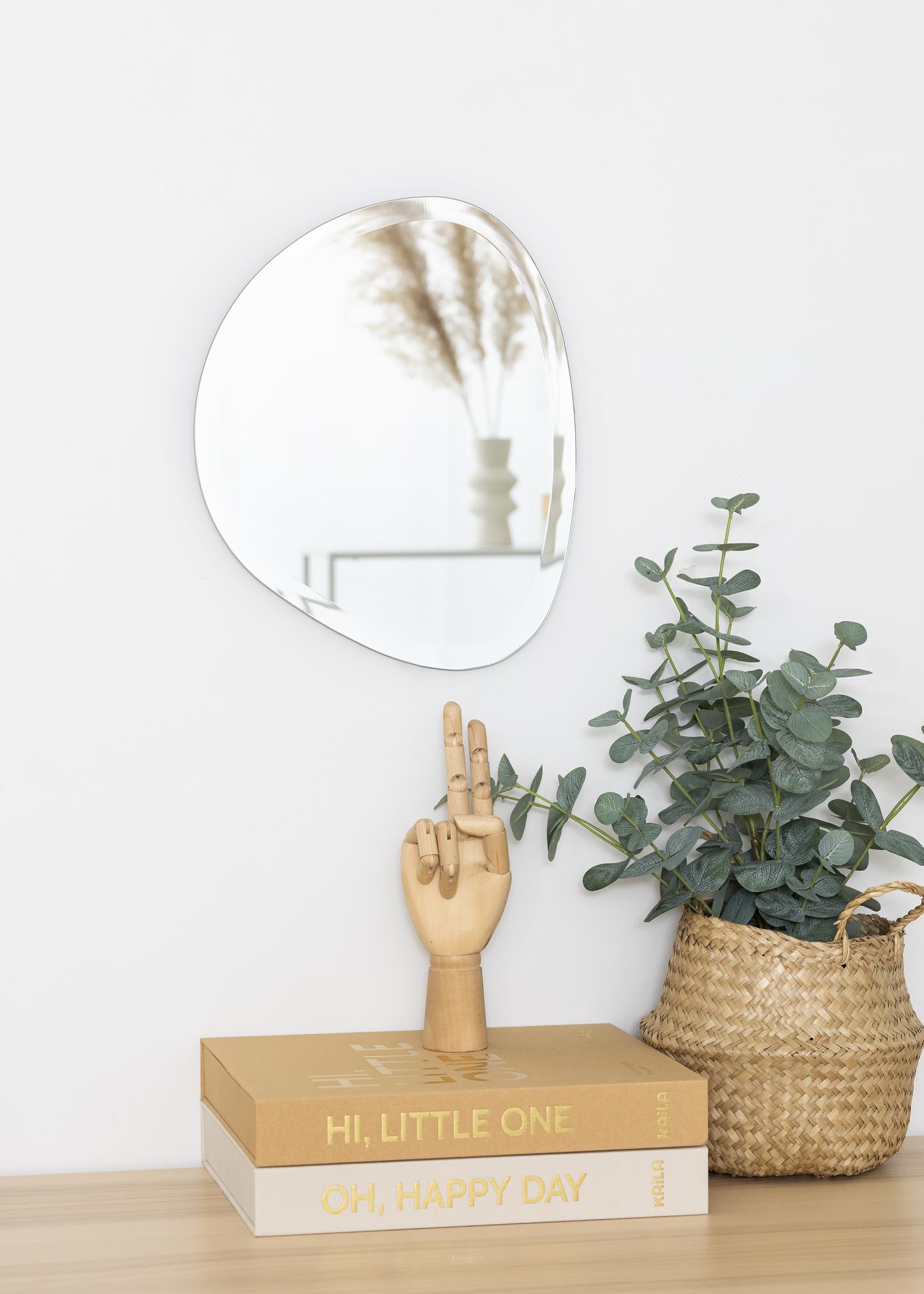 Deze wandspiegel van KAILA heeft een elegante asymmetrische vorm die doet denken aan een druppel. De spiegel is zeer dun en heeft geen lijst, wat in combinatie met de luxe gefacetteerde rand de elegante en moderne uitstraling extra versterkt. Het is een zeer decoratieve wandspiegel die zeker de aandacht zal opeisen in de kamer waarin hij wordt gehangen - zowel in de woonkamer, hal of slaapkamer. De spiegel heeft een afmeting van 30x35 cm.