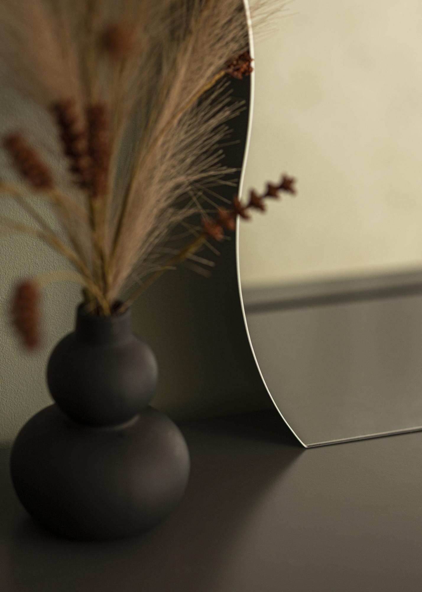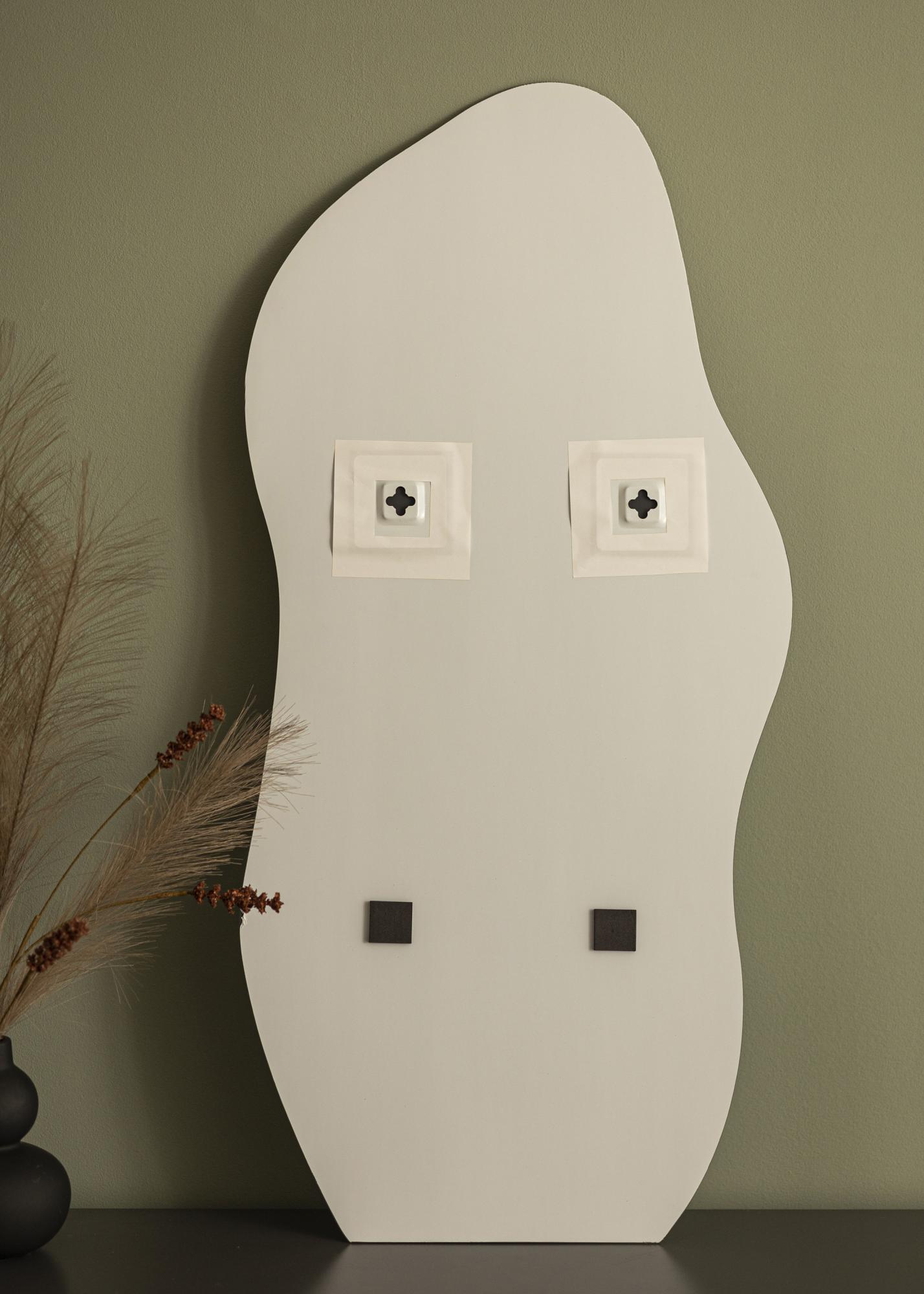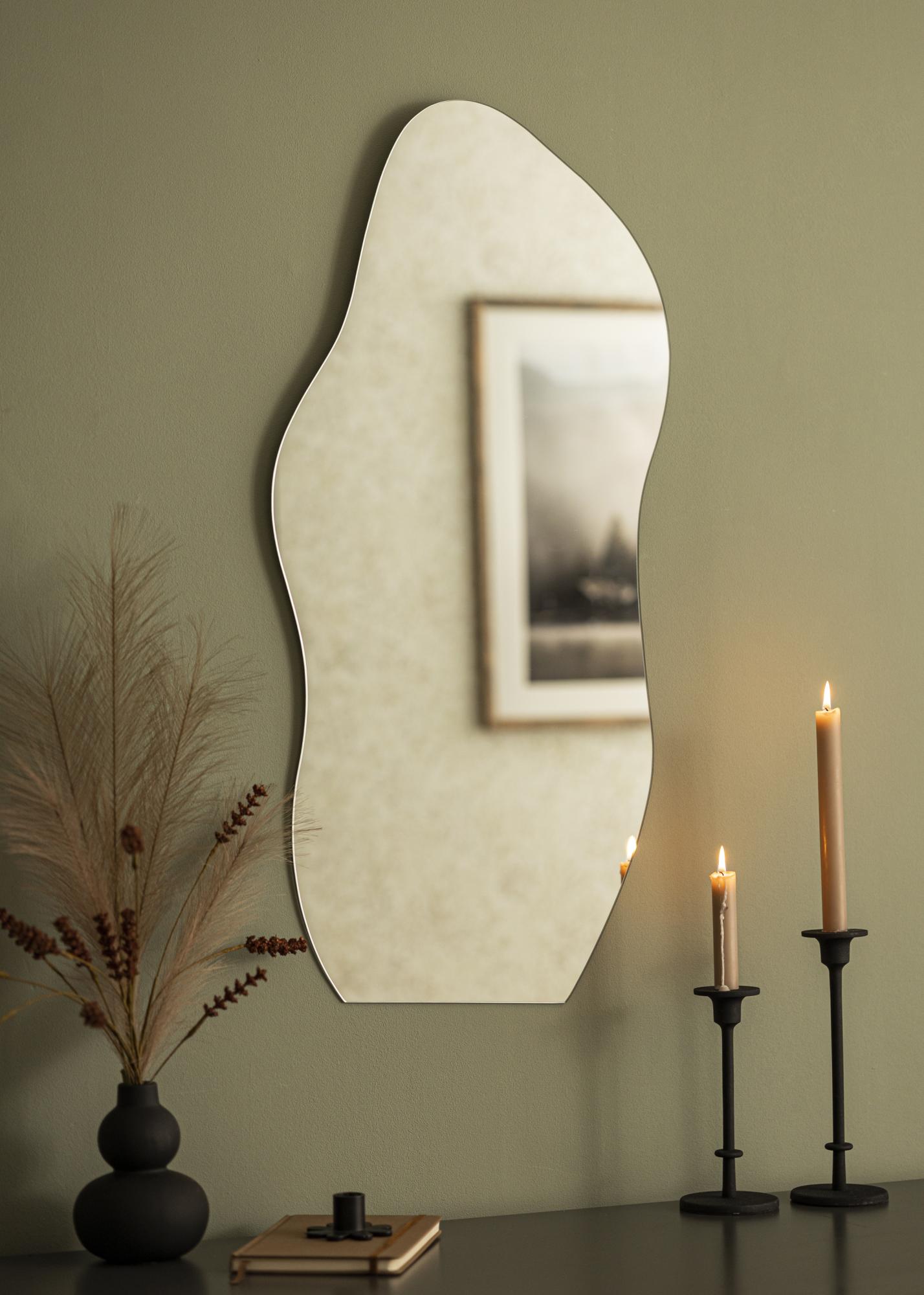 Dit is een wandspiegel in een trendy design, met zijkanten die zachte golvende vorm hebben. De onderkant is recht, wat de spiegel extra elegant maakt om boven een meubelstuk te hangen, waarbij de onderkant van de spiegel een parallelle lijn vormt met de bovenkant van het dressoir of de bijzettafel. De spiegel heeft wandbevestiging aan de achterkant en wordt staand aan de muur opgehangen.