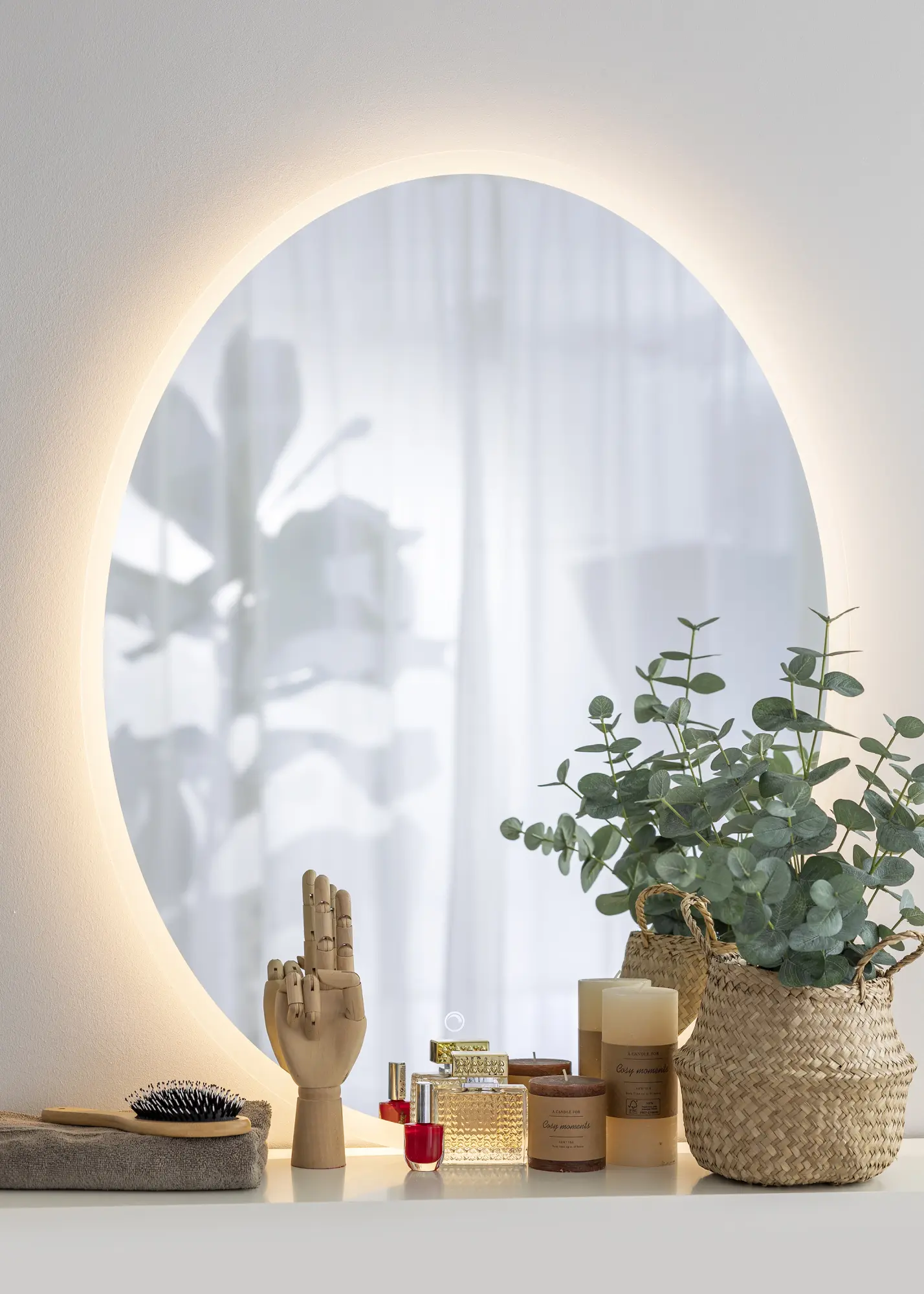 Dit is echt een elegante badkamerspiegel met zijn ovale vorm en geïntegreerde LED-verlichting! De geïntegreerde LED-verlichting is dimbaar en de sterkte kan eenvoudig worden aangepast door op de waterdichte aanraakknop op het scherm te drukken. De verlichting geeft een warm witte tint in 3000K van achter de spiegel en geeft een mooie gloed naar voren. LED is een energiezuinige lichtbron die zorgt voor een gelijkmatig en natuurlijk licht. De spiegel is goedgekeurd voor badkamers. De badkamerspiegel is bedoeld voor vaste installatie en is aangesloten op een schakelaar. Voor een goede werking moet de spiegel worden aangesloten op een normale schakelaar, niet op een dimmer.