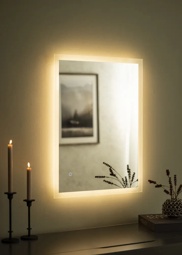 Deze tijdloze spiegel met verlichting zal de uitstraling van je badkamer naar een hoger niveau tillen. De geïntegreerde LED-verlichting straalt vanaf de achterkant van de spiegel naar voren, wat de verlichting een zachtere uitstraling geeft. De verlichting van 3000K kan worden gedimd tussen 10% - 100% van de helderheid. Om het licht te dimmen, houd je de touchknop aan de onderkant op de spiegel een paar seconden ingedrukt.