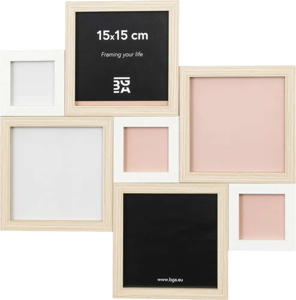 Dit kader heeft ruimte voor 7 afbeeldingen, drie in formaat 8x8 cm en vier in formaat 15x15 cm. Het is gemaakt van MDF en uitgerust met echt glas, dat je afbeeldingen beschermt tegen stof. Aan de achterkant vind je wandbevestiging voor eenvoudige bevestiging aan je muur. Om je afbeeldingen te kunnen plaatsen, buig je de pinnen aan de achterkant omhoog. Op deze manier kun je de achterwanden losmaken en je afbeeldingen eenvoudig in het frame plaatsen.