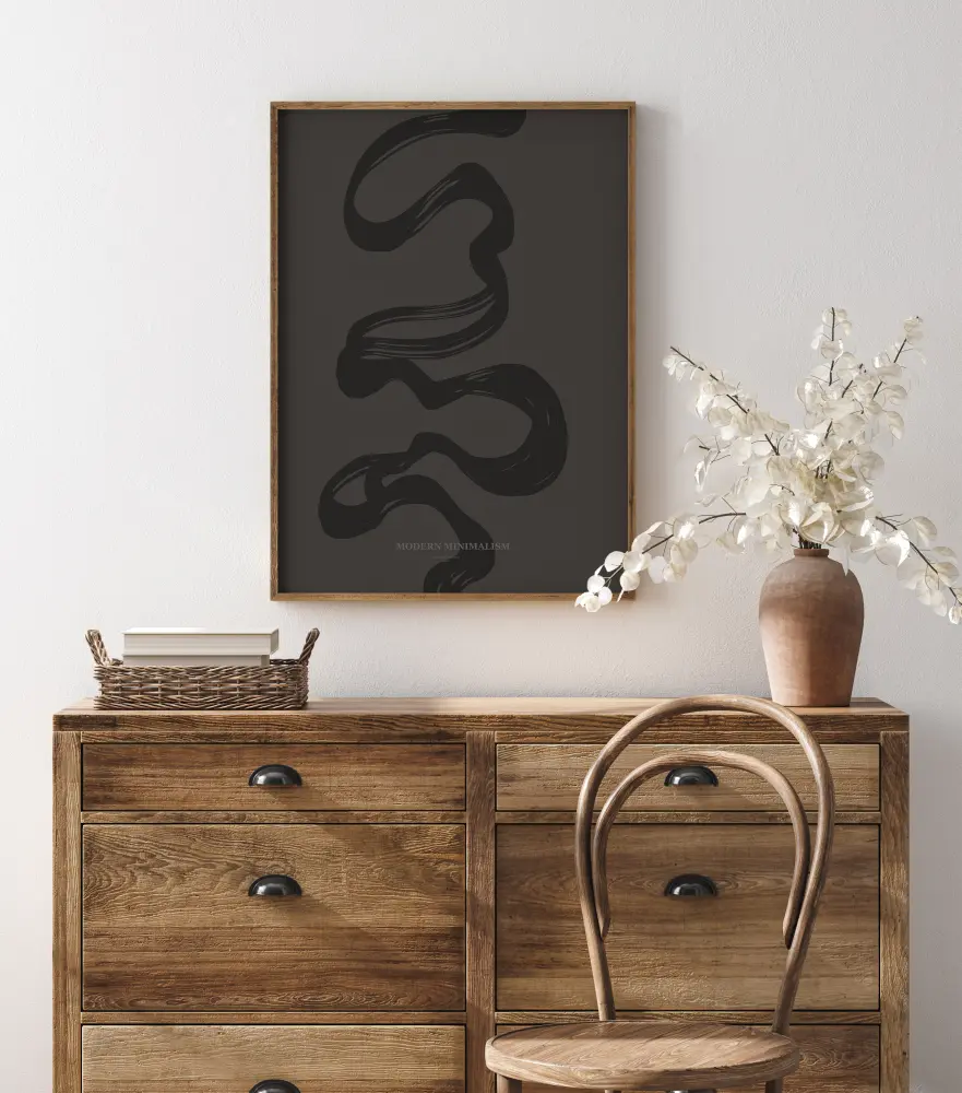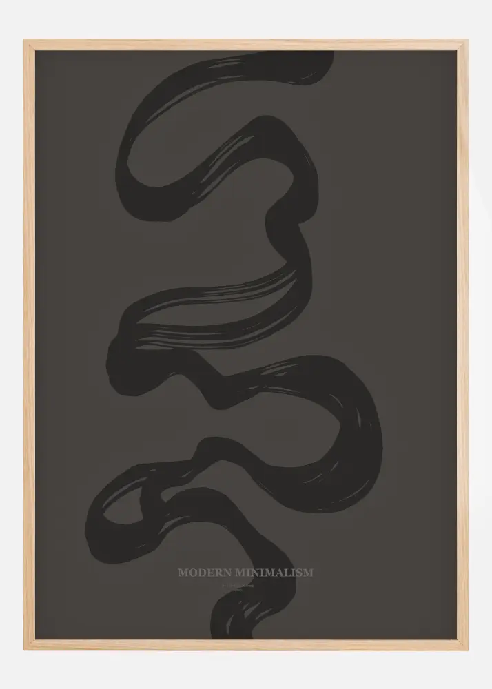 Een poster van een zwellende grijze lijn van boven naar beneden op een matbruine achtergrond dat een gevoel van vrijheid en beweging creëert. Met het opschrift "Modern Minimalisme" onderaan is het slangachtige patroon een zaligheid. Een interessante en perfecte poster voor de muur van een woonkamer in elk huis.