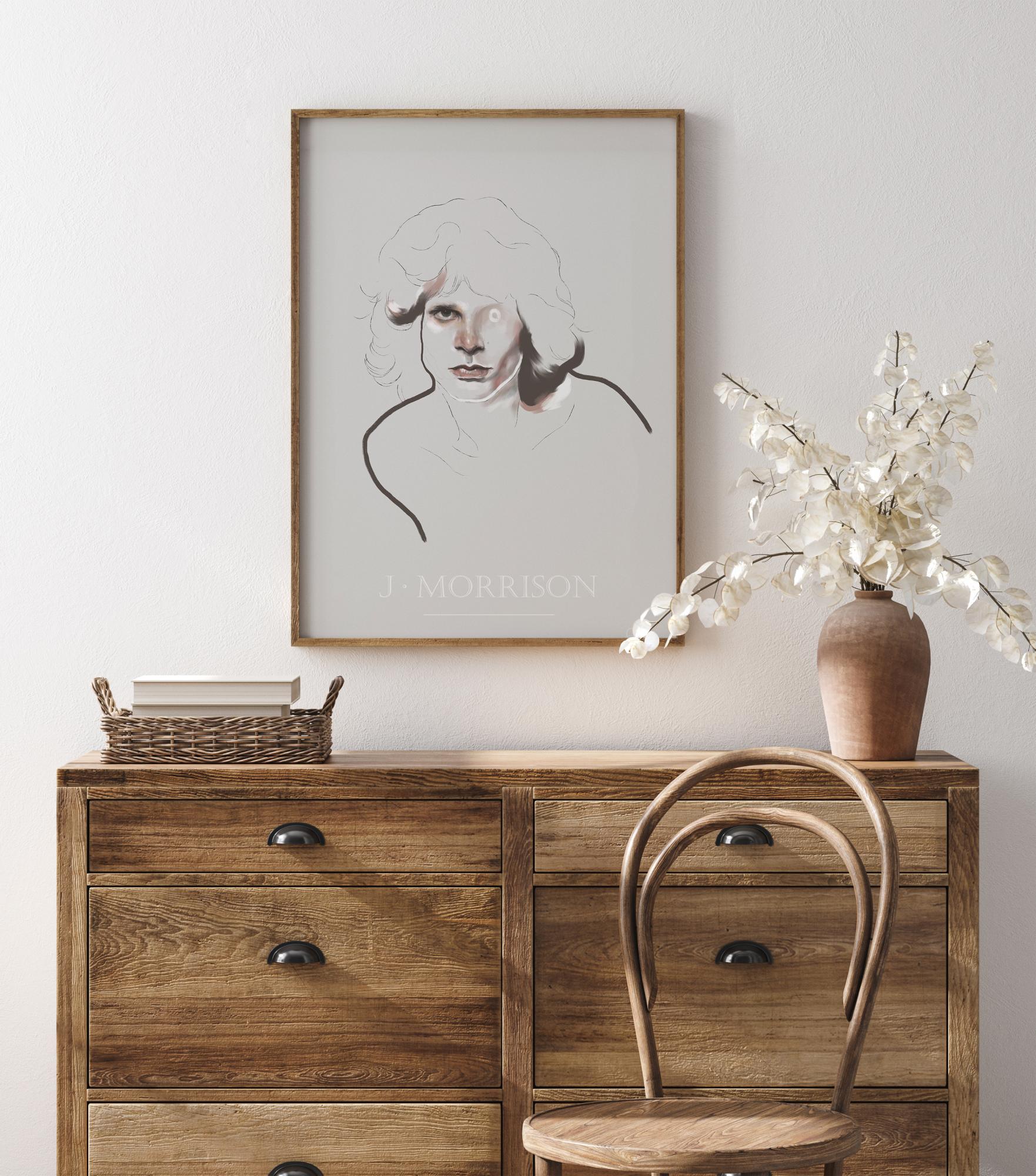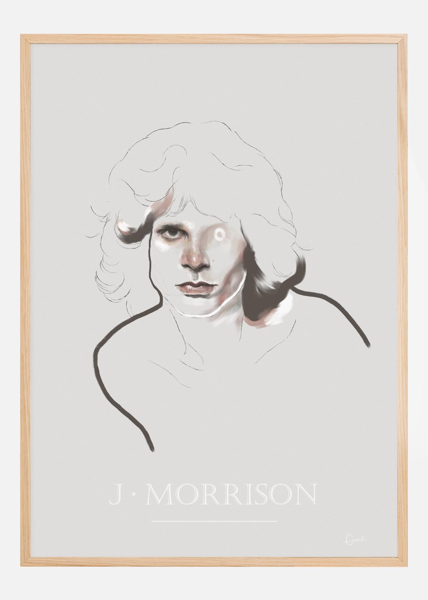 Een prachtige poster van J. Morrison. Op een beige achtergrond zijn het hoofd en de schouders van de artiest met een zwarte pen getekend, terwijl de mond met bruin is omlijnd. Het linkeroog is zonder oogleden. Een ideale poster voor iedereen die van zijn muziek houdt.