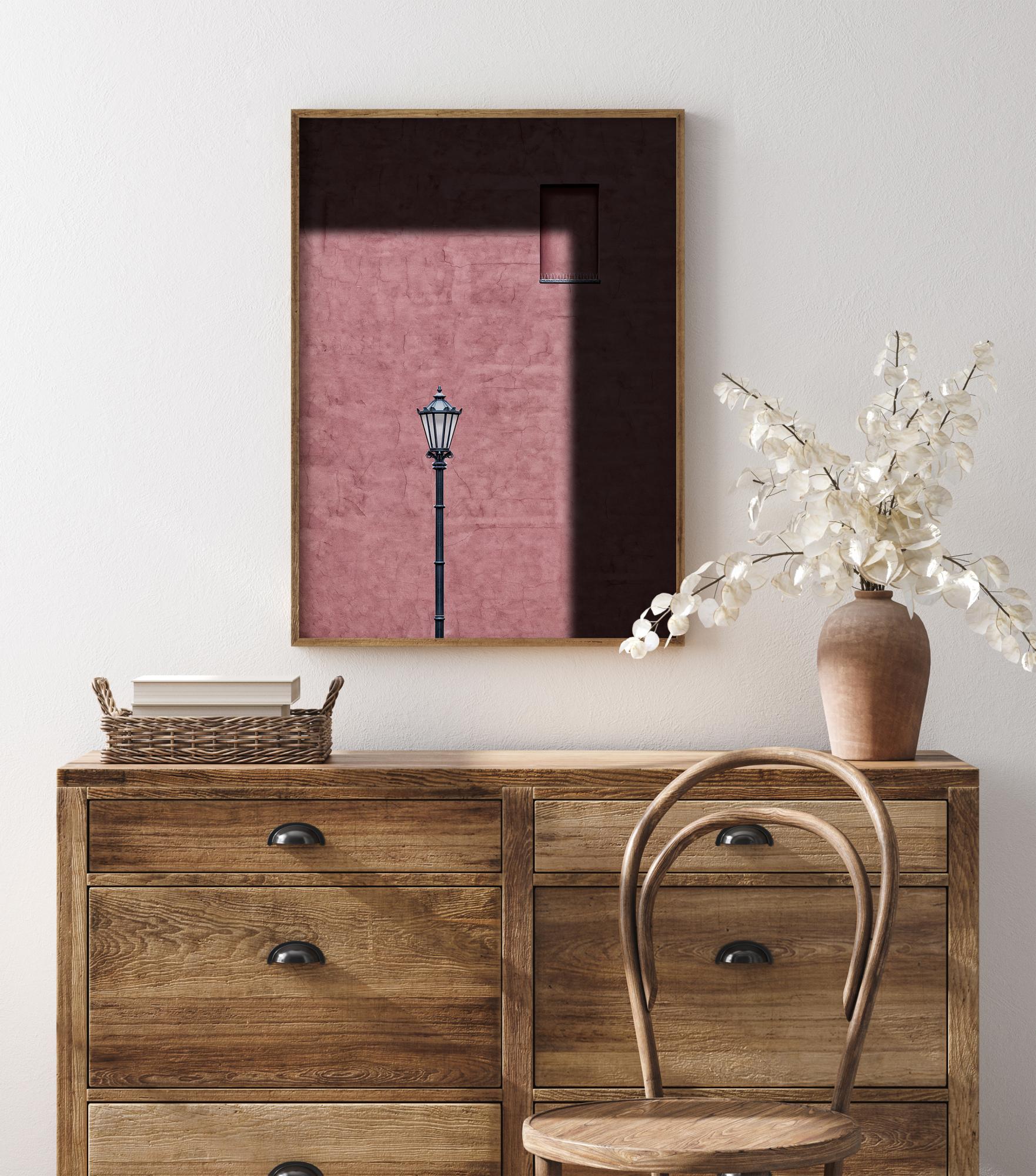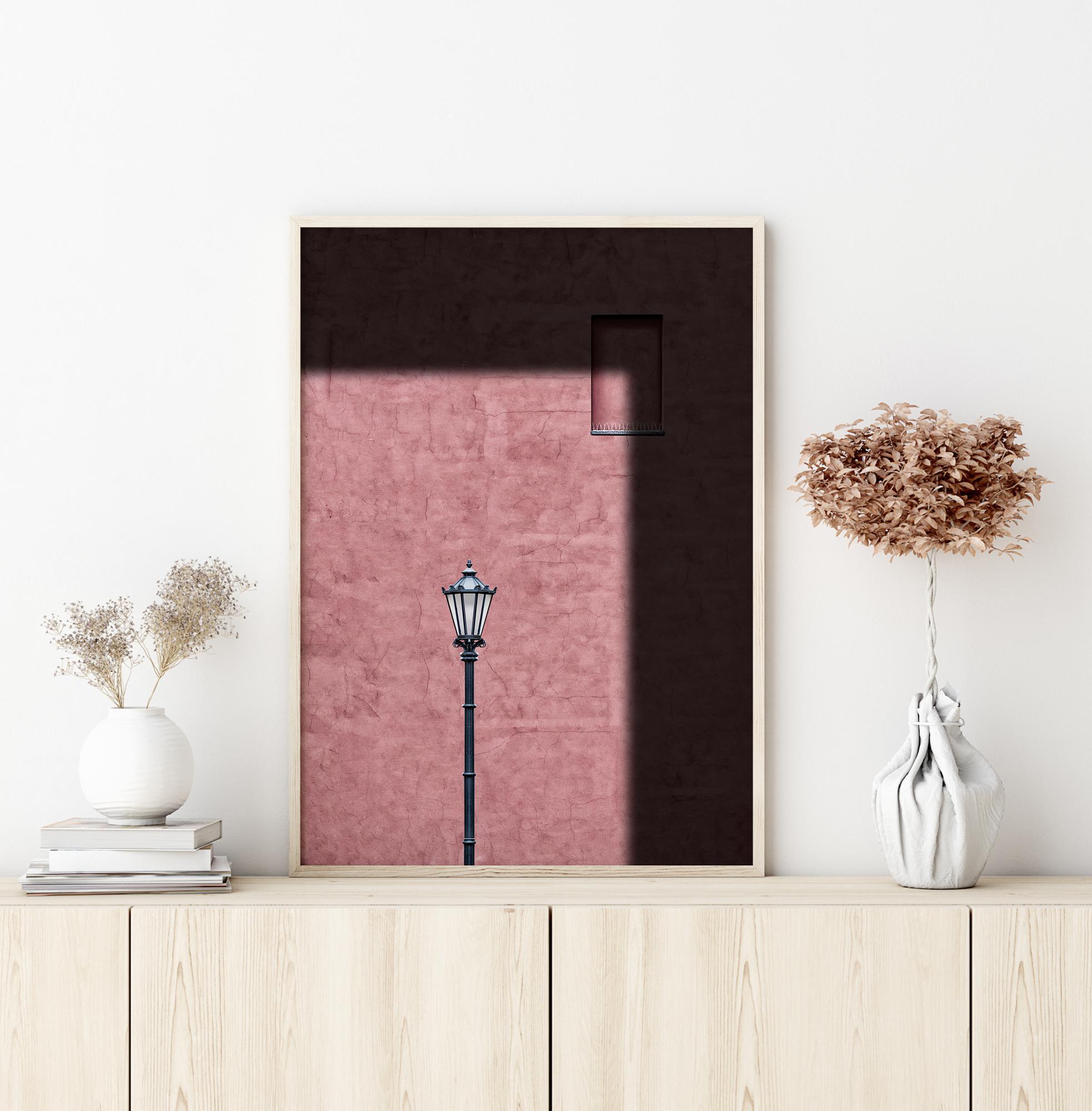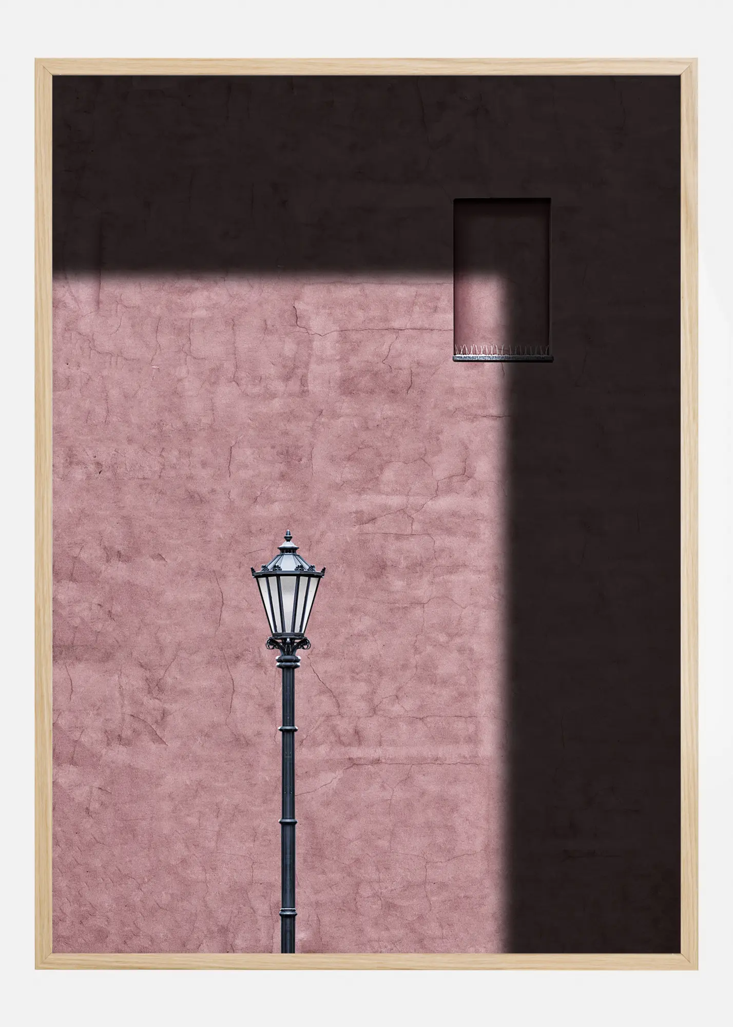 Een kleurrijke poster van een roze gevel met een buitenlamp in het midden. Het natuurlijke zonlicht schijnt op de muur en laat het bovenste deel van de poster in het donker. Een klein ingemetseld raam is te zien in de rechterbovenhoek. Breng wat licht in huis met deze zachtroze poster.