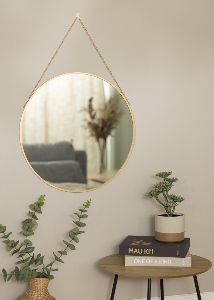Laat deze wandspiegel elegantie toevoegen aan je huis! De spiegel heeft een verfijnd uiterlijk met een ronde vorm en een dun frame met een diepte van slechts 8 mm. Het mooie frame is gemaakt van metaal en heeft een exclusieve goudkleurige afwerking. De elegante indruk wordt voltooid door de goudkleurige ketting die wordt gebruikt om de spiegel mee op te hangen.