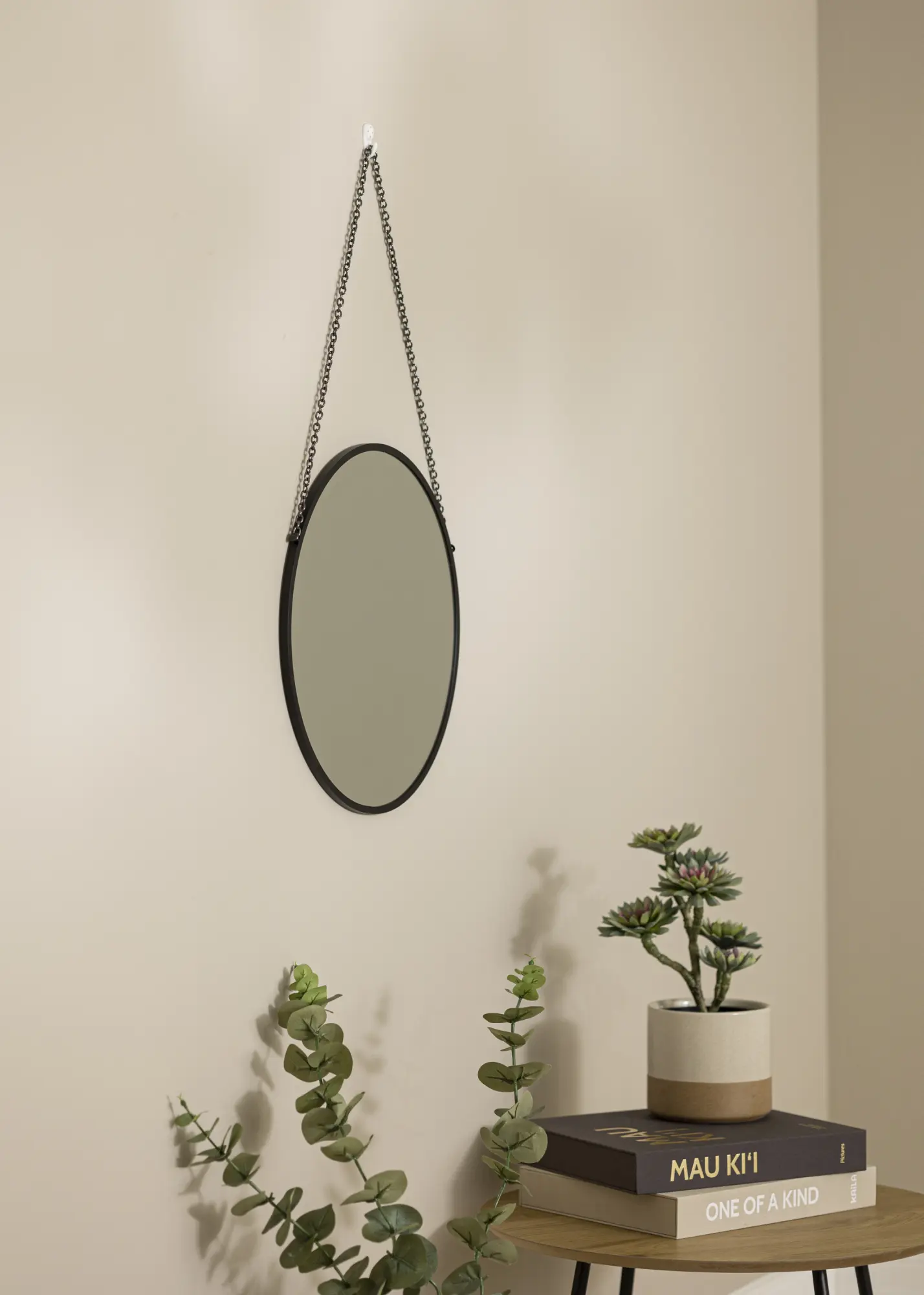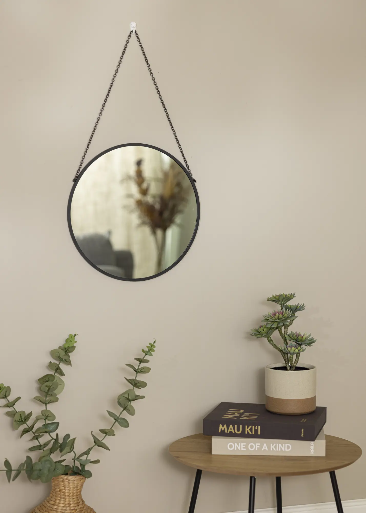 Een spiegel die aan een ketting aan de muur hangt, heeft een speciale uitstraling die een zeer decoratieve sfeer geeft aan elke kamer. Deze ronde wandspiegel is bevestigd aan een zwarte metalen ketting, die perfect past bij het zwarte metalen frame van de spiegel. Het frame heeft een diepte van slechts 8 mm, wat een mooie en elegante uitstraling geeft.