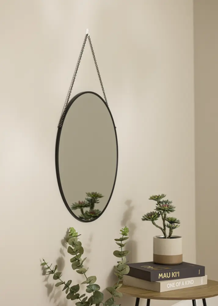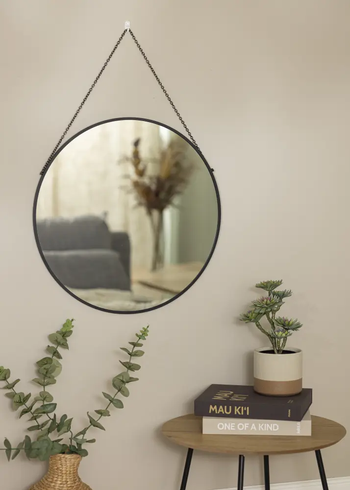 Een spiegel die aan een ketting aan de muur hangt, heeft een speciale uitstraling die een zeer decoratieve sfeer geeft aan elke kamer. Deze ronde wandspiegel is bevestigd aan een zwarte metalen ketting, die perfect past bij het zwarte metalen frame van de spiegel. Het frame heeft een diepte van slechts 8 mm, wat een mooie en elegante uitstraling geeft.