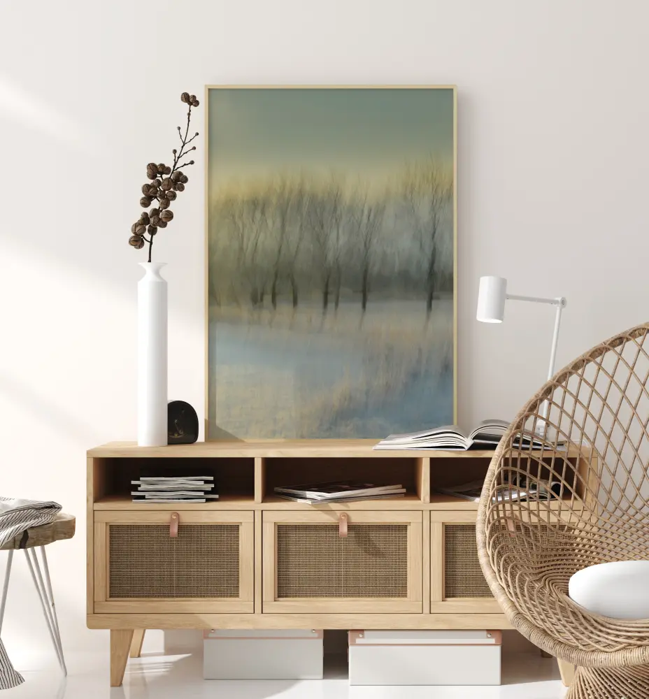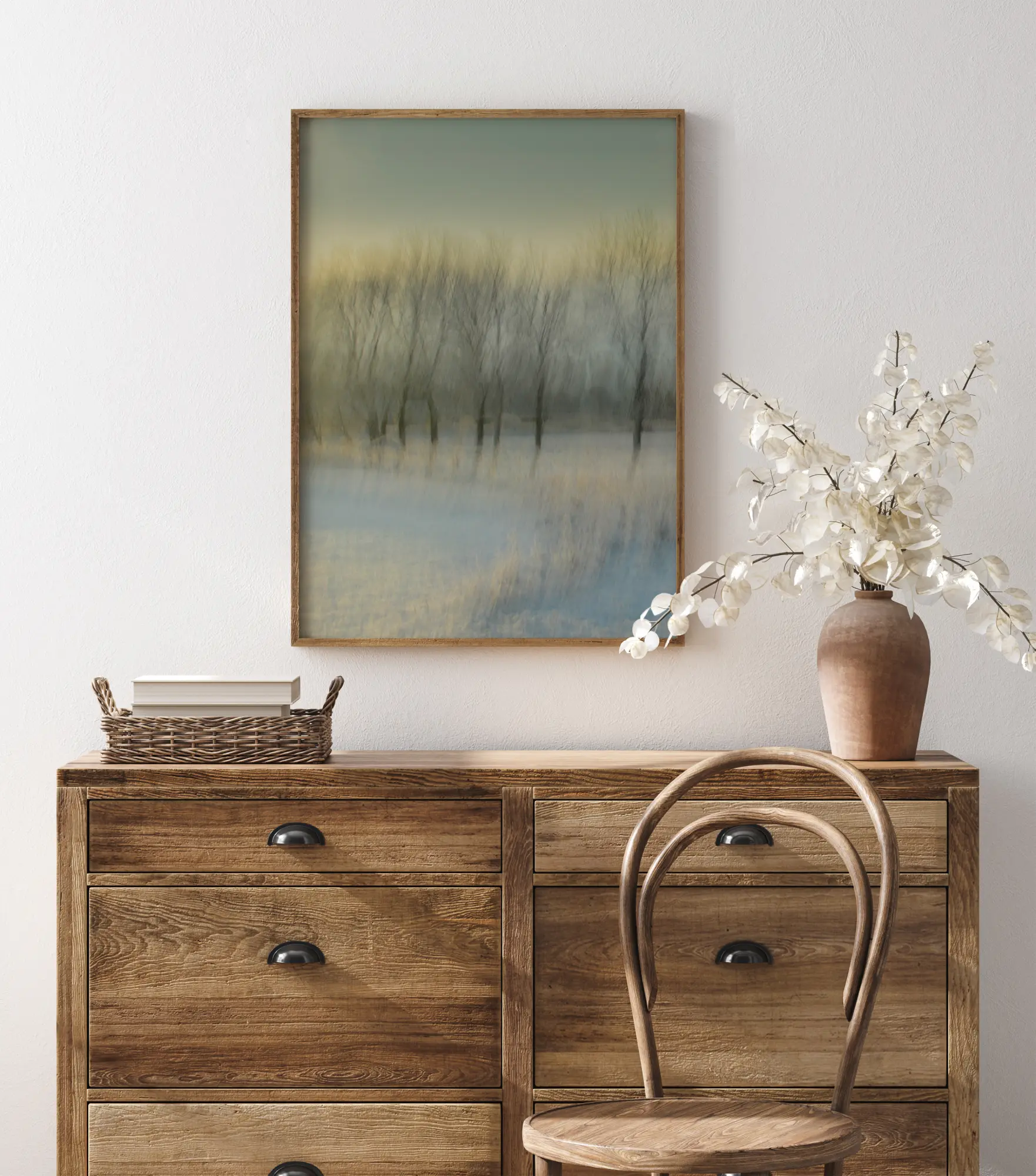 Een prachtige motion blur stijl poster van bomen op een winterse achtergrond. Witte sneeuw bedekt alles in dit zachte, onscherpe beeld. De bomen zijn wazig, alleen hoge zwarte stammen zijn te zien en een band van zacht geel zweeft over de boomtoppen. Magie hangt in de lucht.